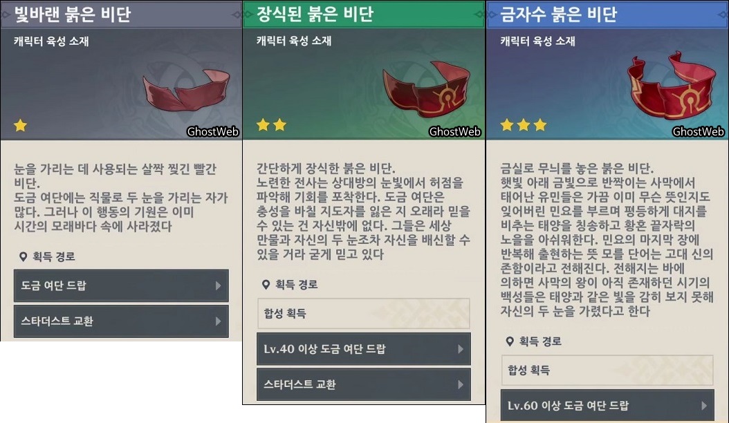 - 빛바랜 붉은 비단, 장식된 붉은 비단, 금자수 붉은 비단 (도금 여단 처치/위치)