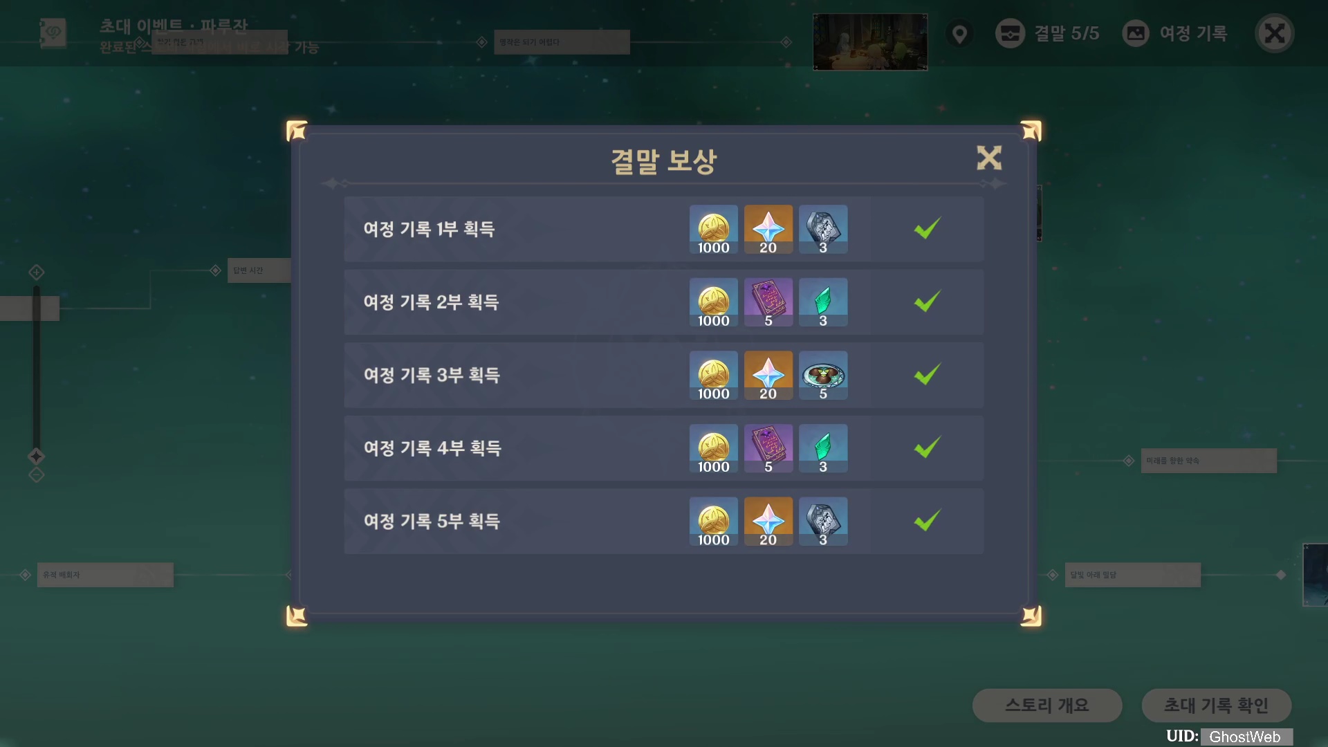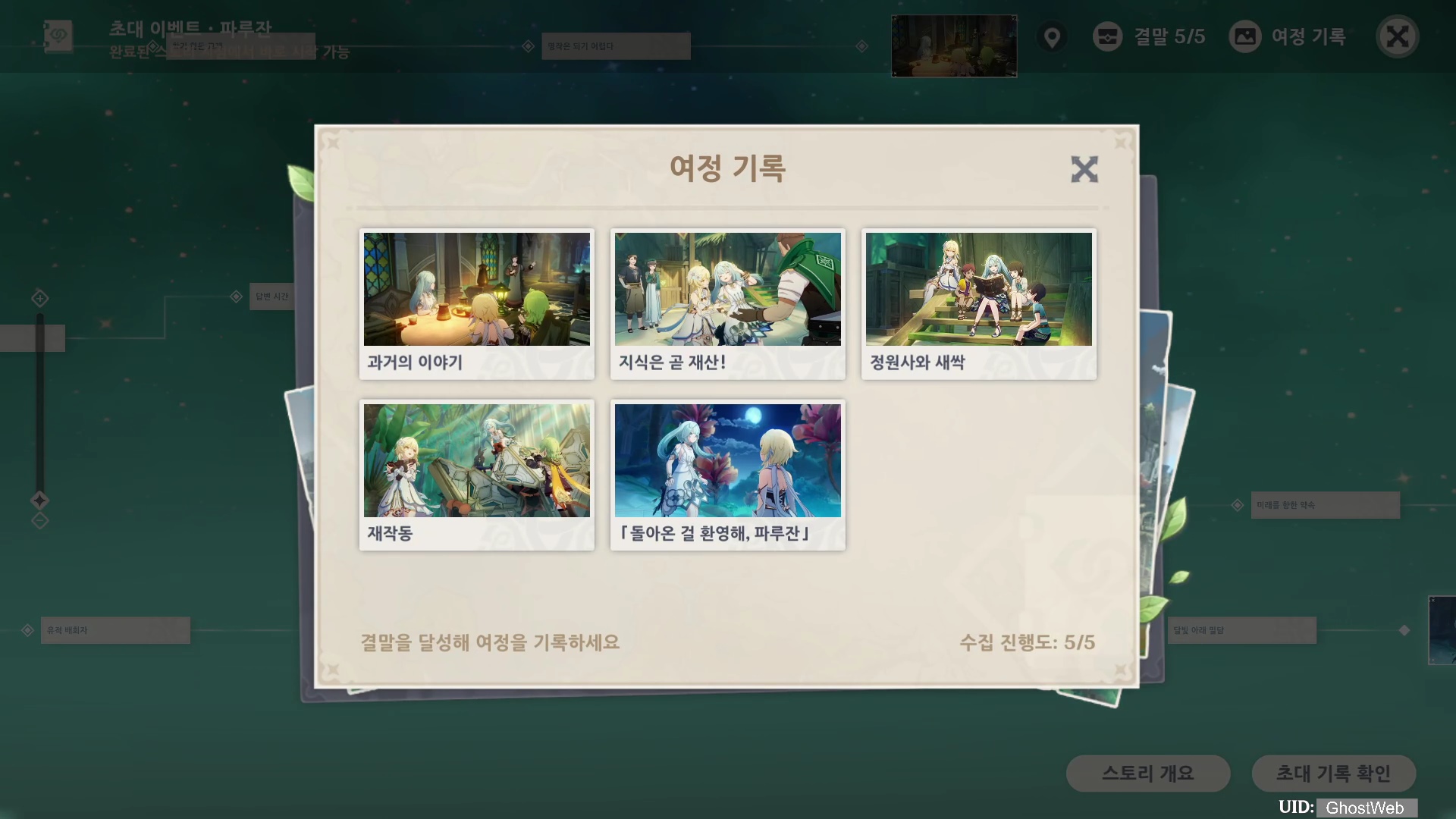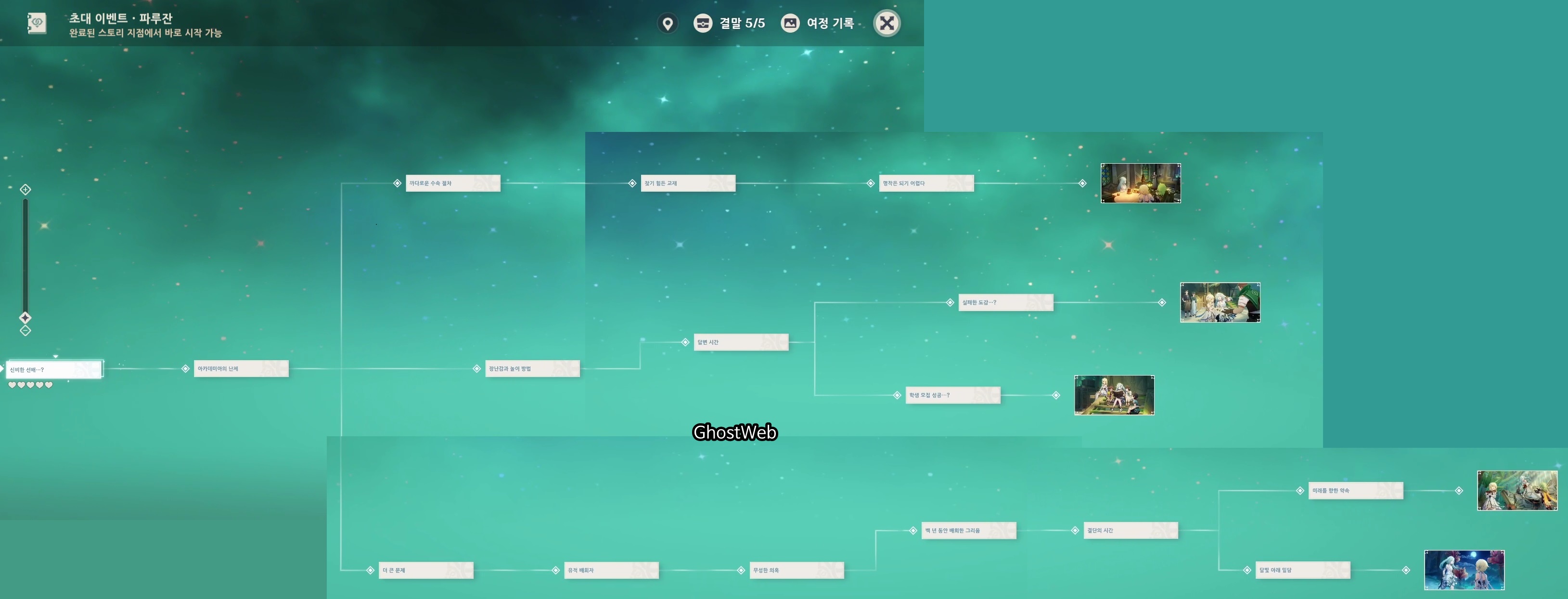 파루잔 초대 이벤트 <제1막 - 풀기 어려운 매듭>은 총 5개의 여정 기록(엔딩)으로 나눠져 있으며, 각 엔딩을 볼 때마다 원석, 경험치 책 등의 보상을 얻을 수 있어요.