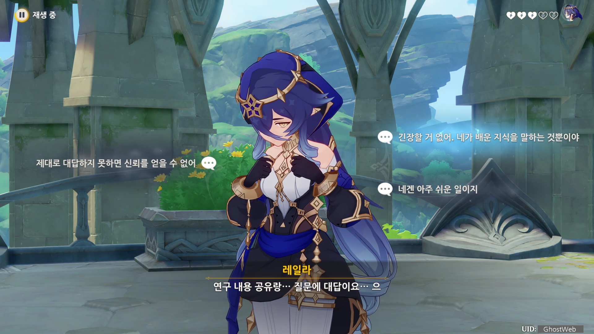 - 레일라는 지혜의 선령이 논문 문제를 해결해 줄 것이라 말한다.