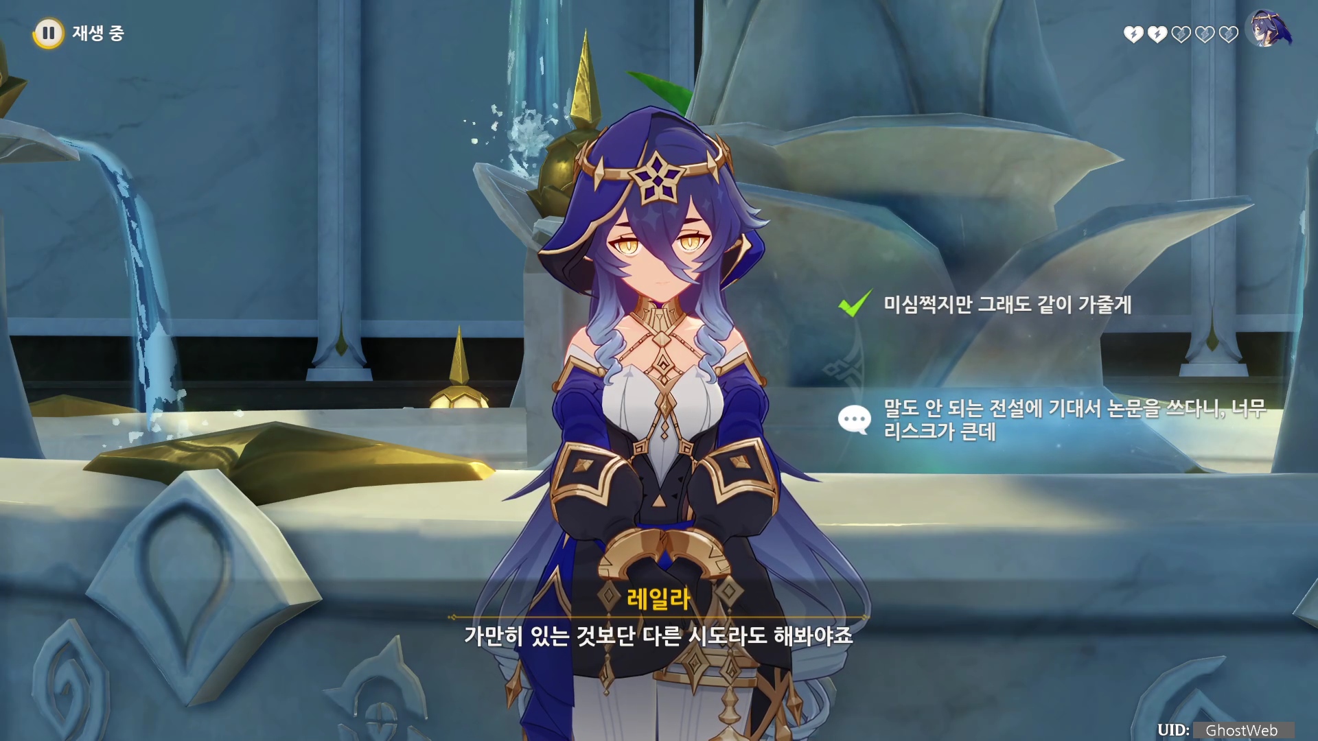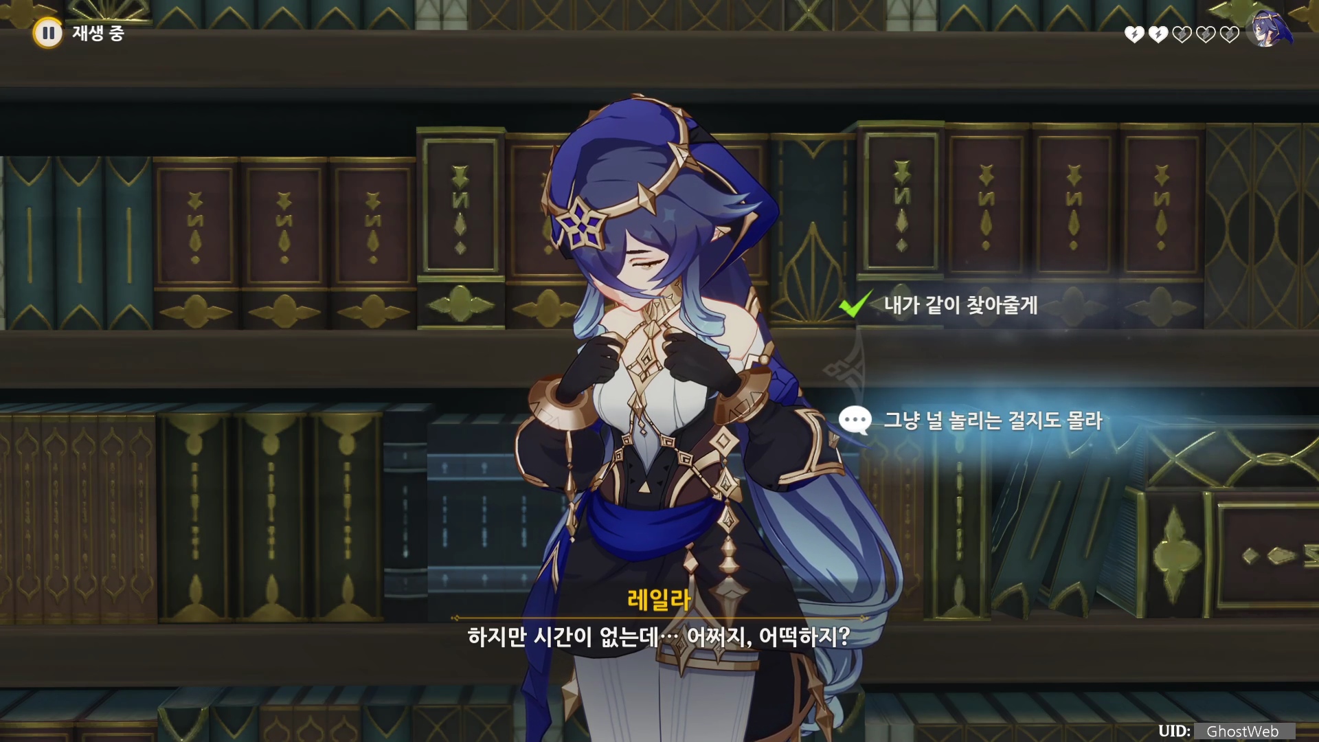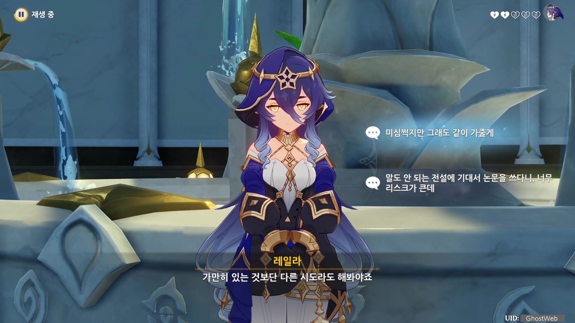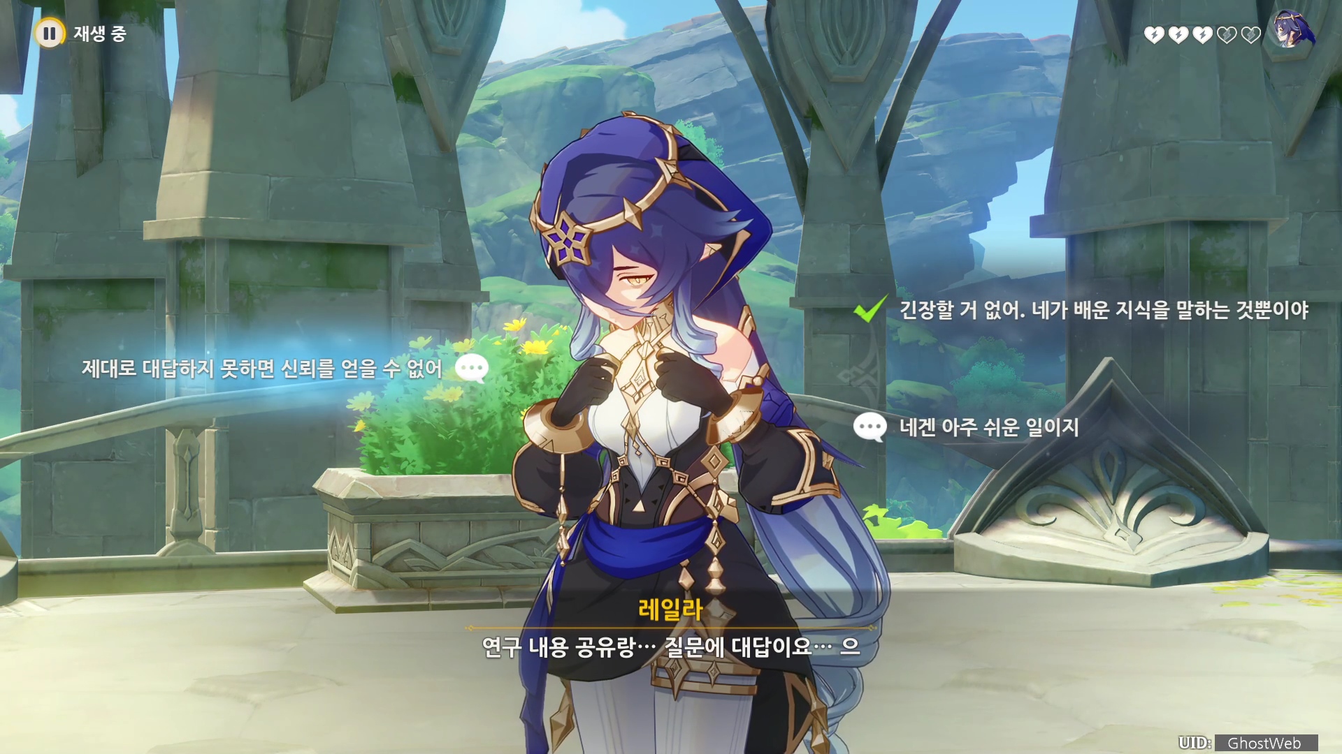 - 레일라는 지혜의 선령이 논문 문제를 해결해 줄 것이라 말한다.