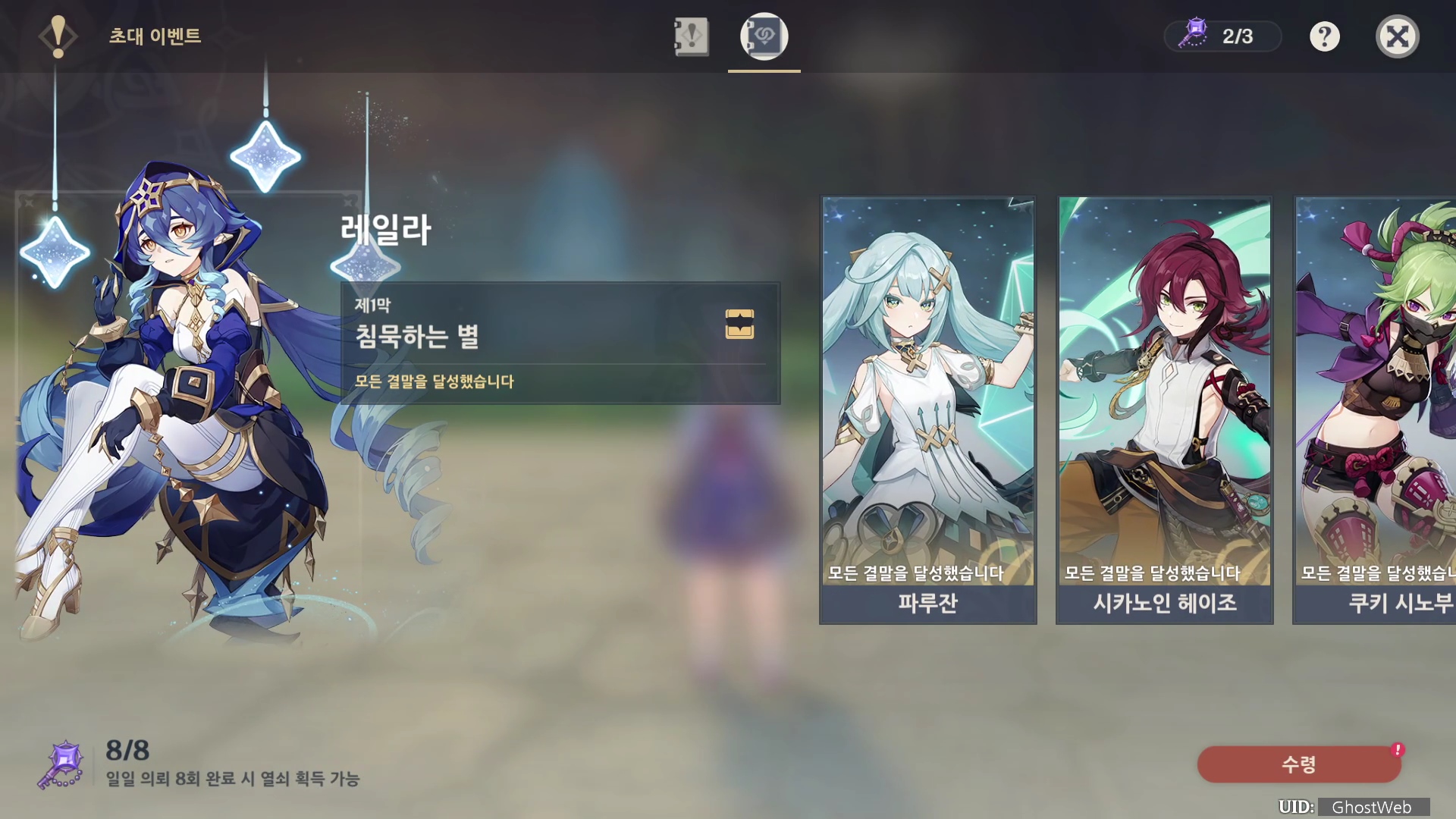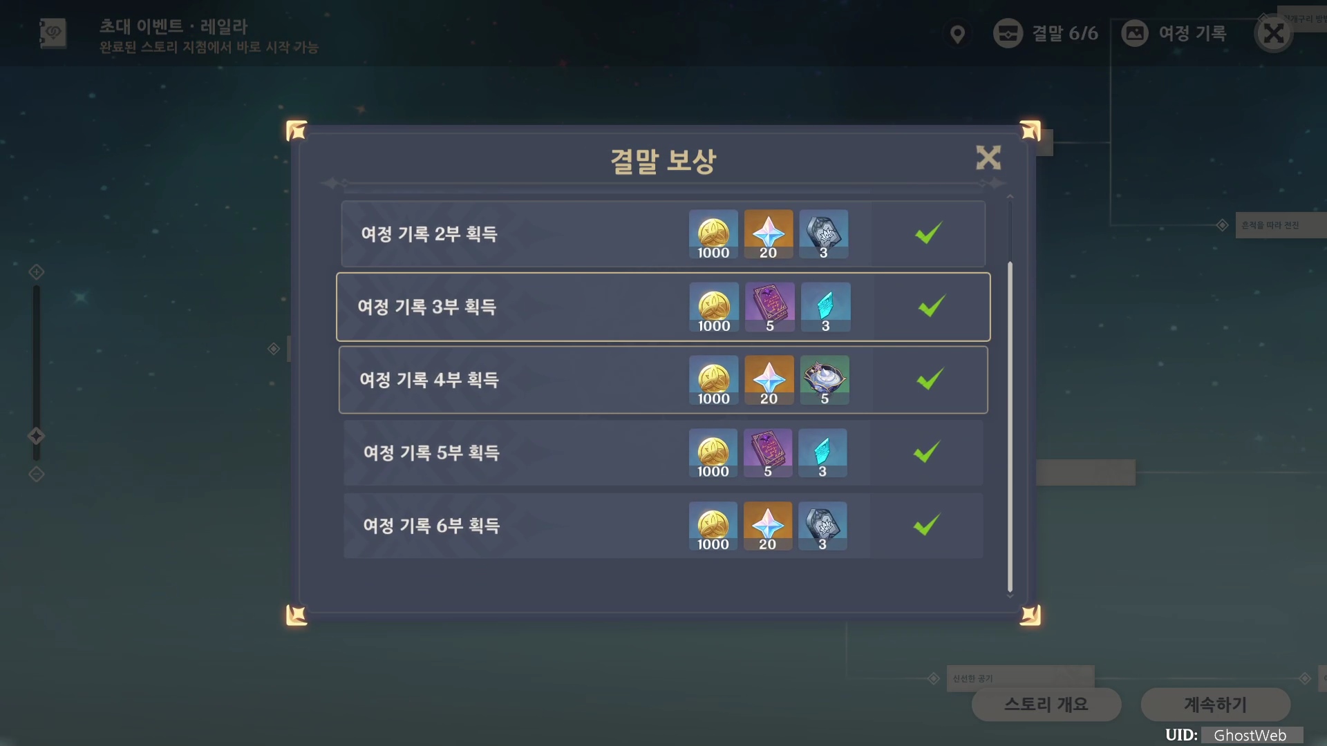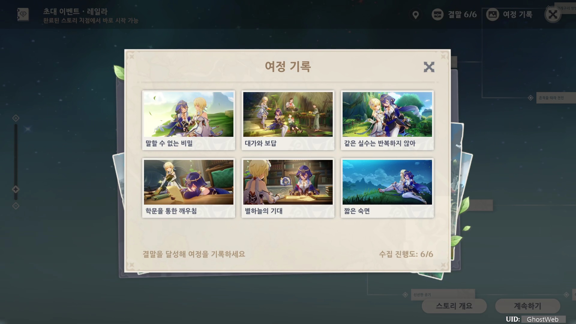레일라 초대 이벤트 <제1막 - 침묵하는 별>은 총 6개의 여정 기록(엔딩)으로 나눠져 있으며, 각 엔딩을 볼 때마다 원석, 경험치 책 등의 보상을 얻을 수 있어요.