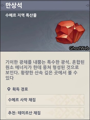만상석은 3.6 버전에서 나온 신규 사막 지역 지하에 많이 분포하고 있으며, 다른 광물처럼 양손검 캐릭터로 만상석을 공격하여 얻을 수 있어요.