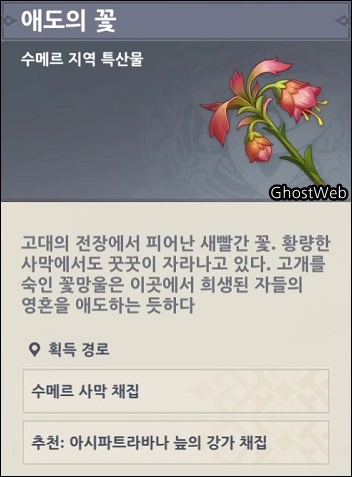이번에는 수메르 지역 특산물 애도의 꽃을 파밍할 수 있는 위치를 정리해보도록 할게요.