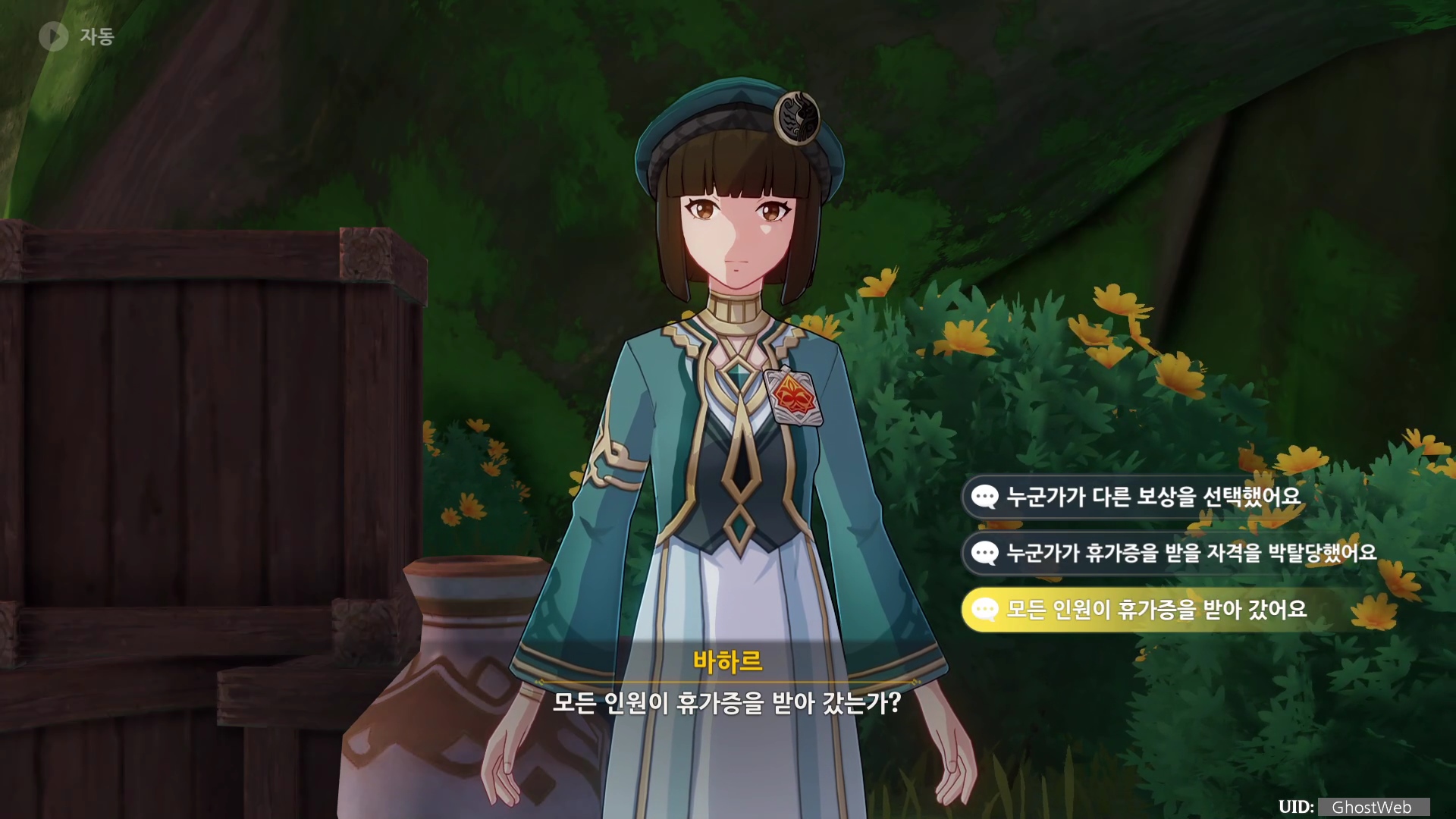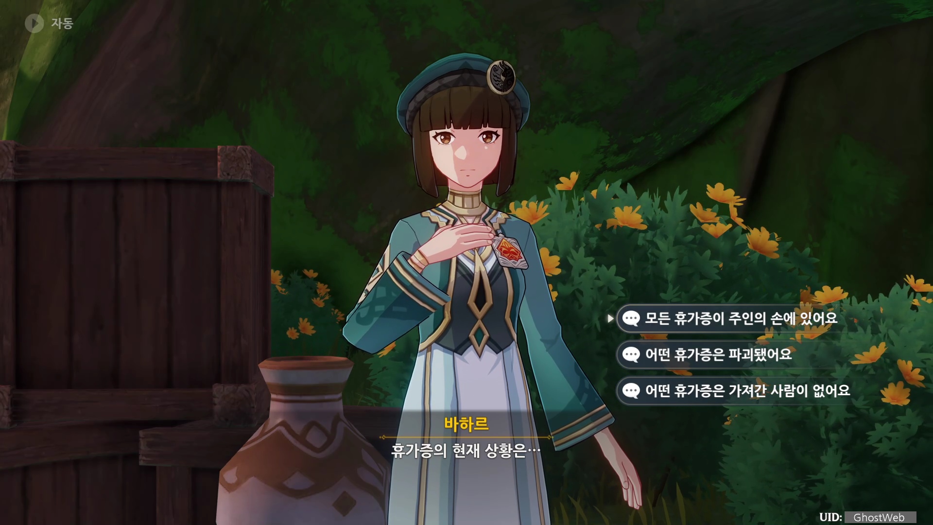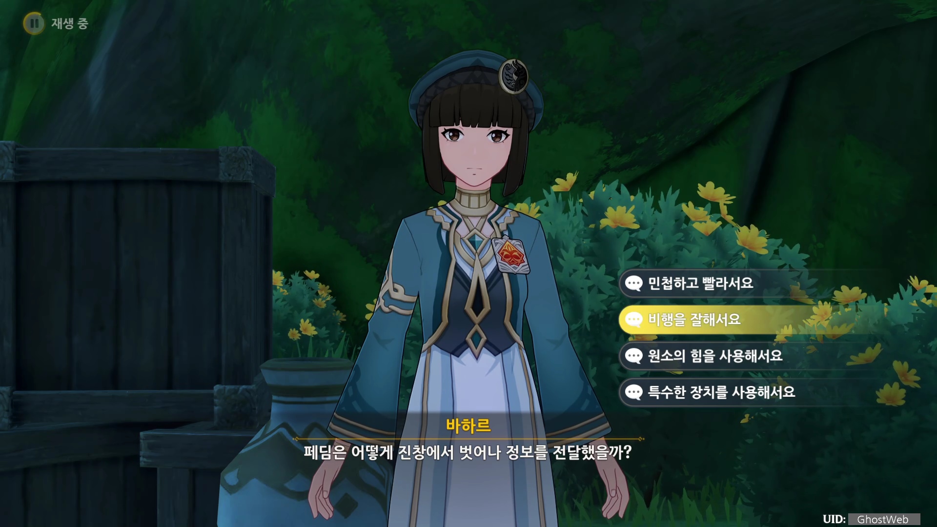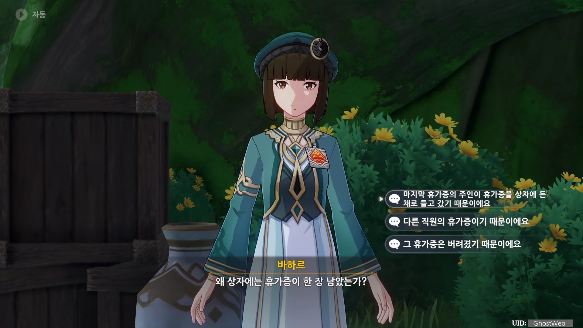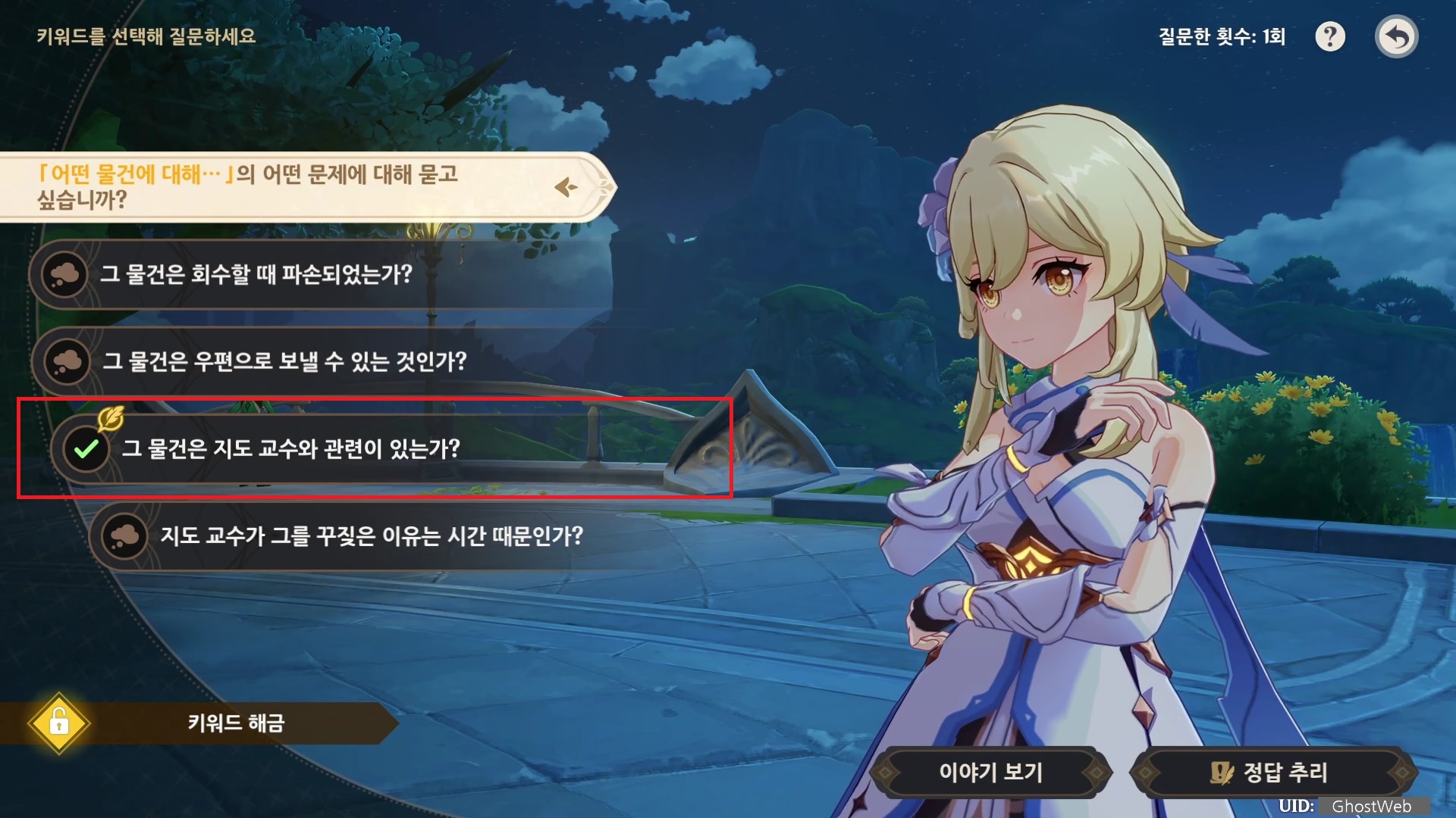 힌트를 얻고 오른쪽 아래에 있는 정답 추리 버튼을 눌러 바하르가 물어보는 질문지에서 정답을 선택하면 되는데, 바로 정답 추리로 들어 갈 수 있는지는 모르겠지만, 먼저 정답을 써 놓고 제가 선택한 항목을 정리하도록 할게요.