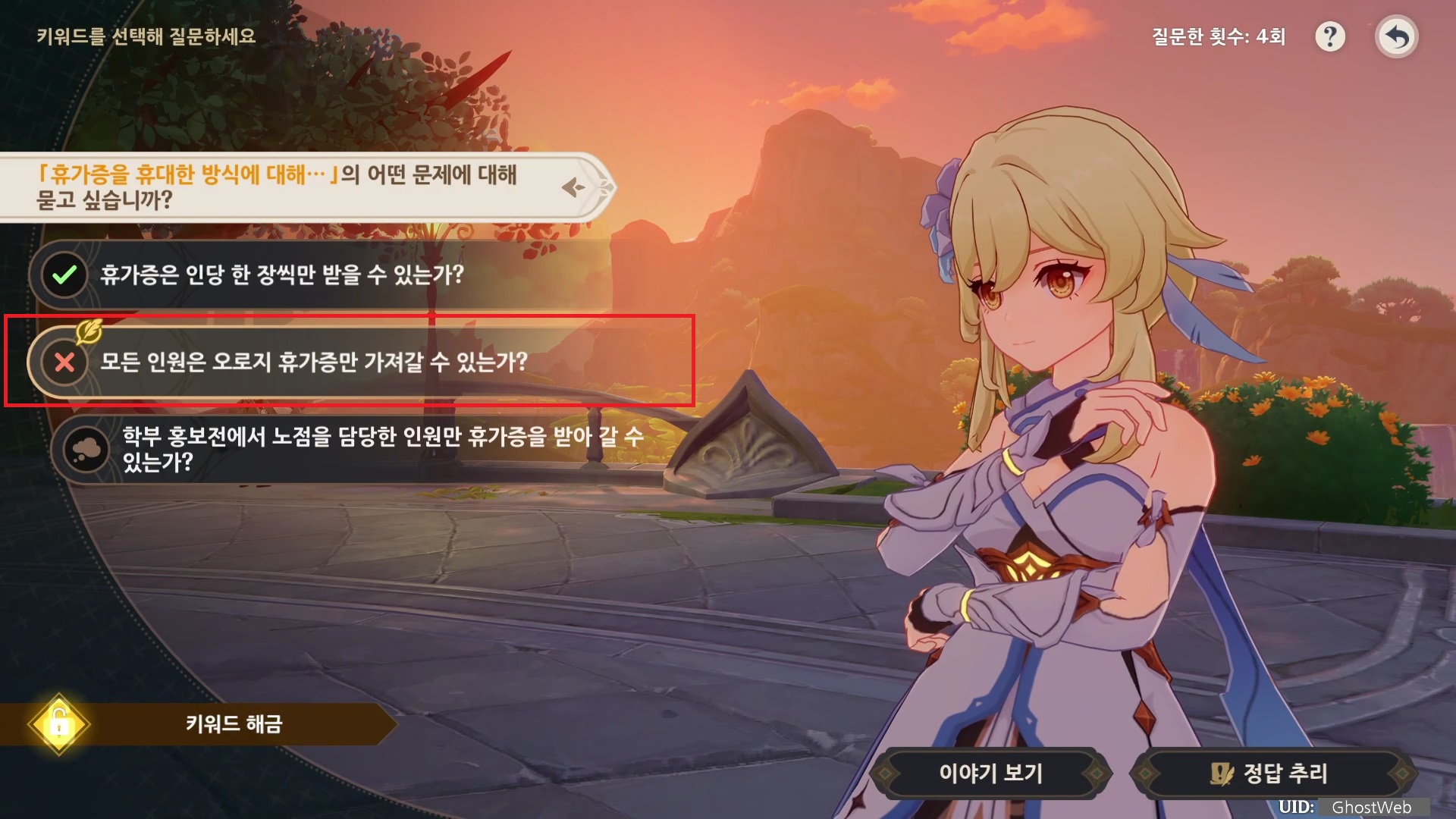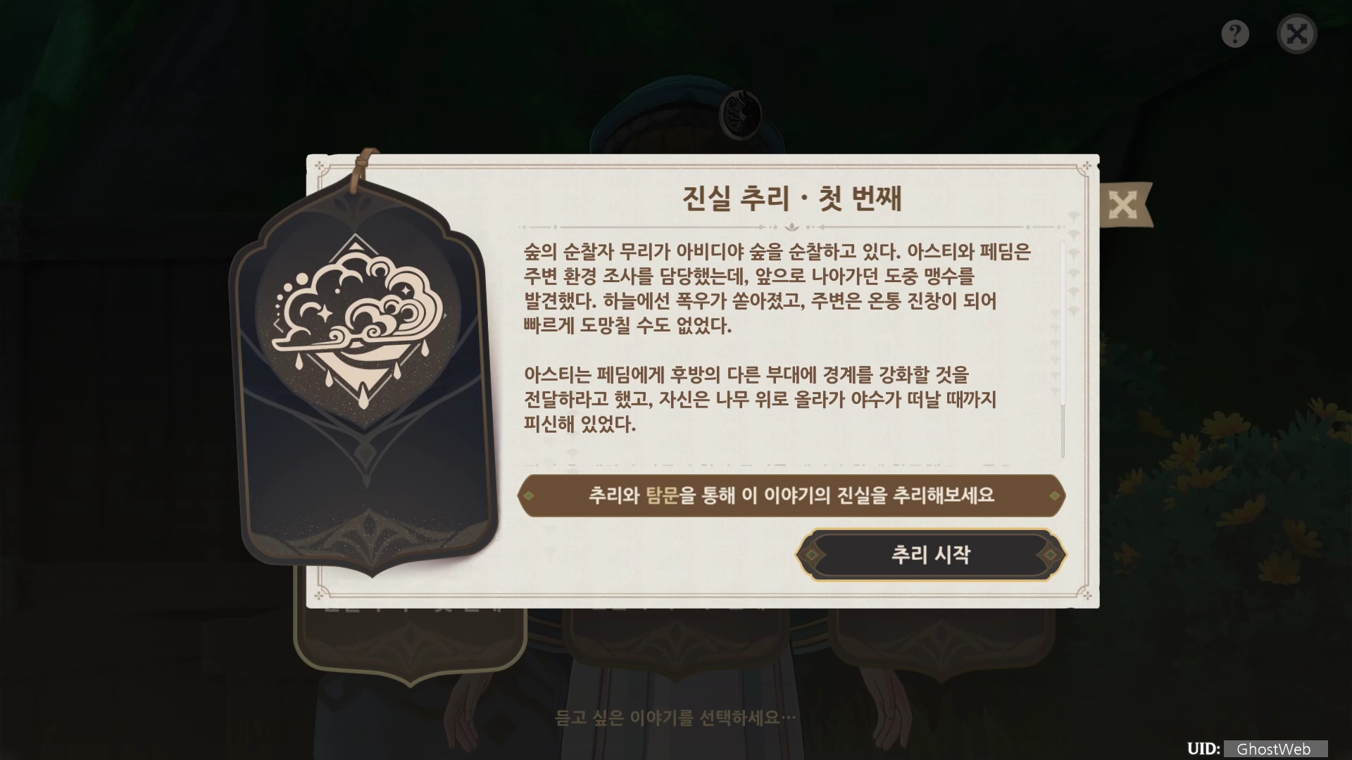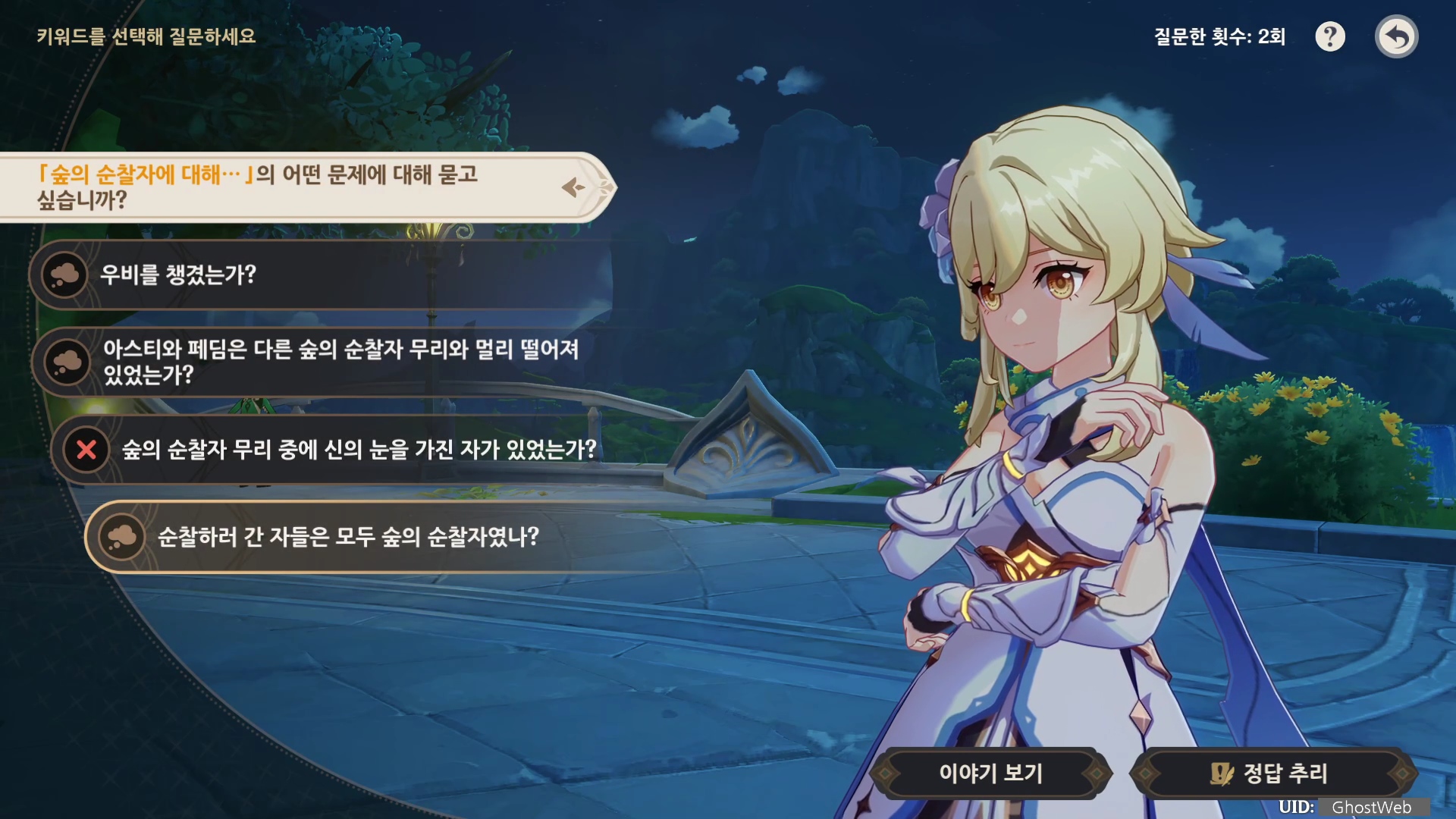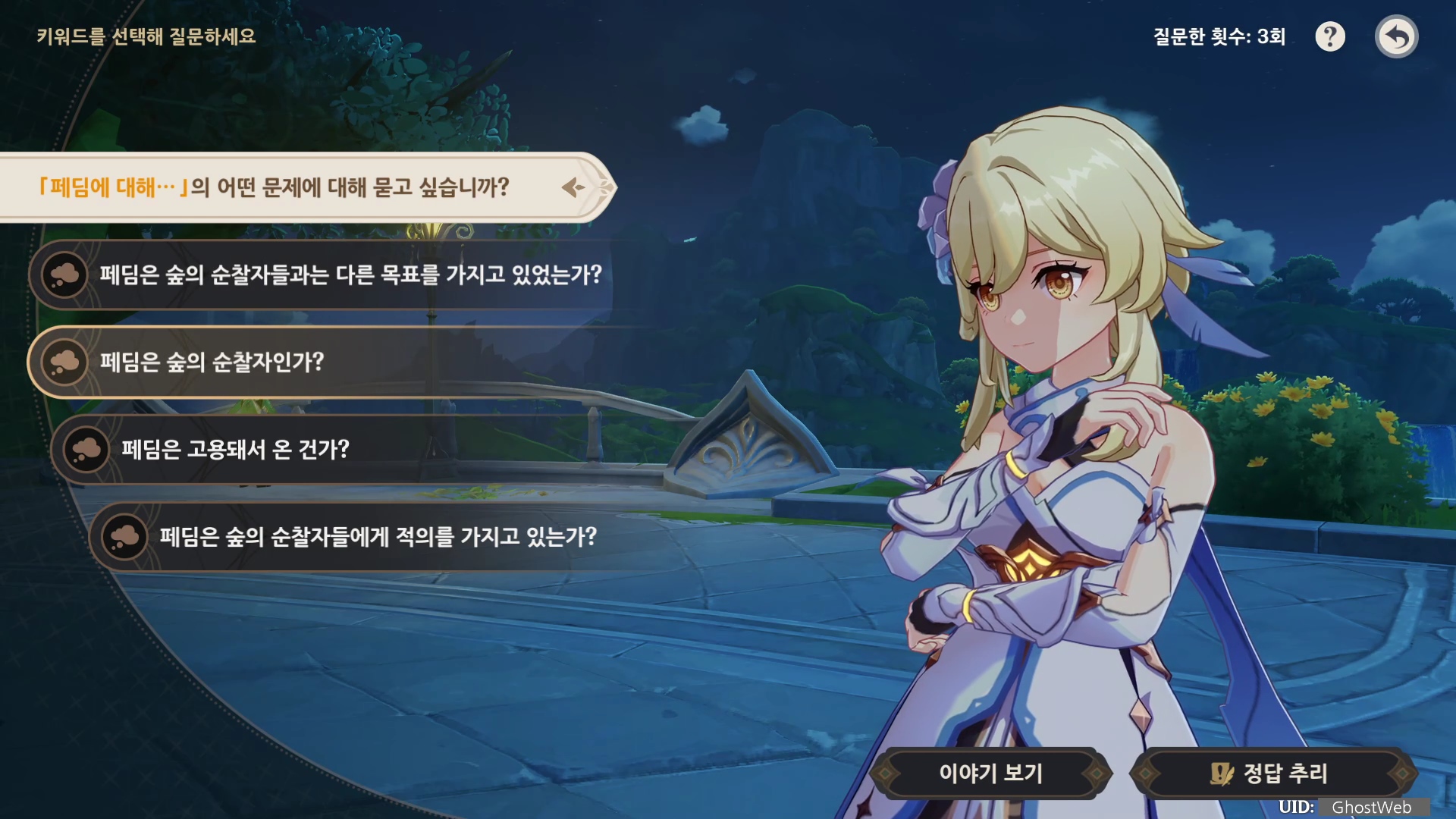 해당 이벤트는 바하르의 말을 듣고 질문 내용을 골라 힌트를 유추하여 정답을 추리하는 것으로 힌트 중 중요한 질문을 선택하면 다음 키워드가 해금되어 다른 질문을 할 수 있어요.