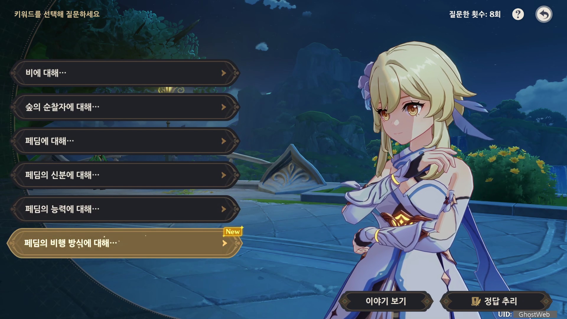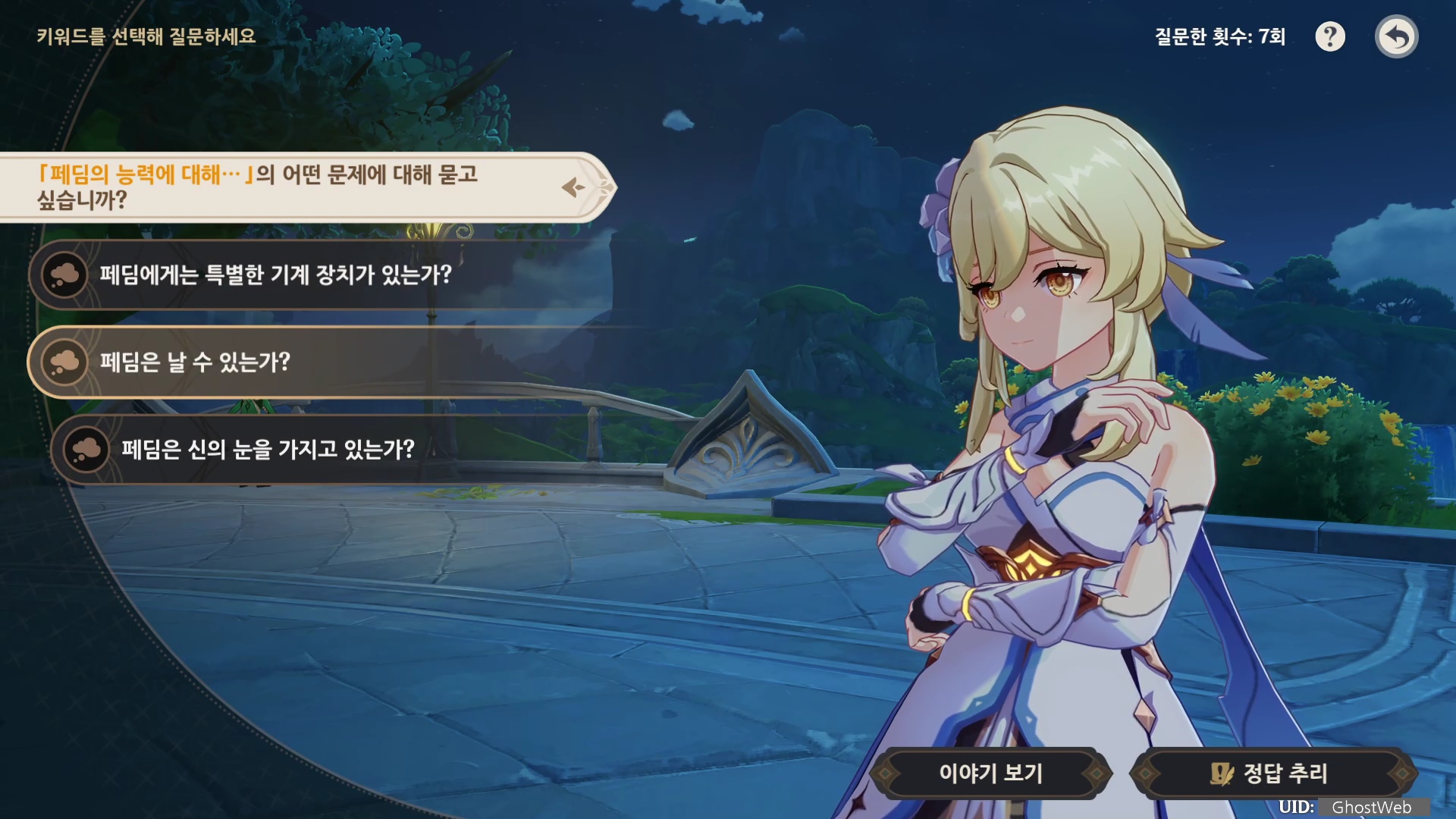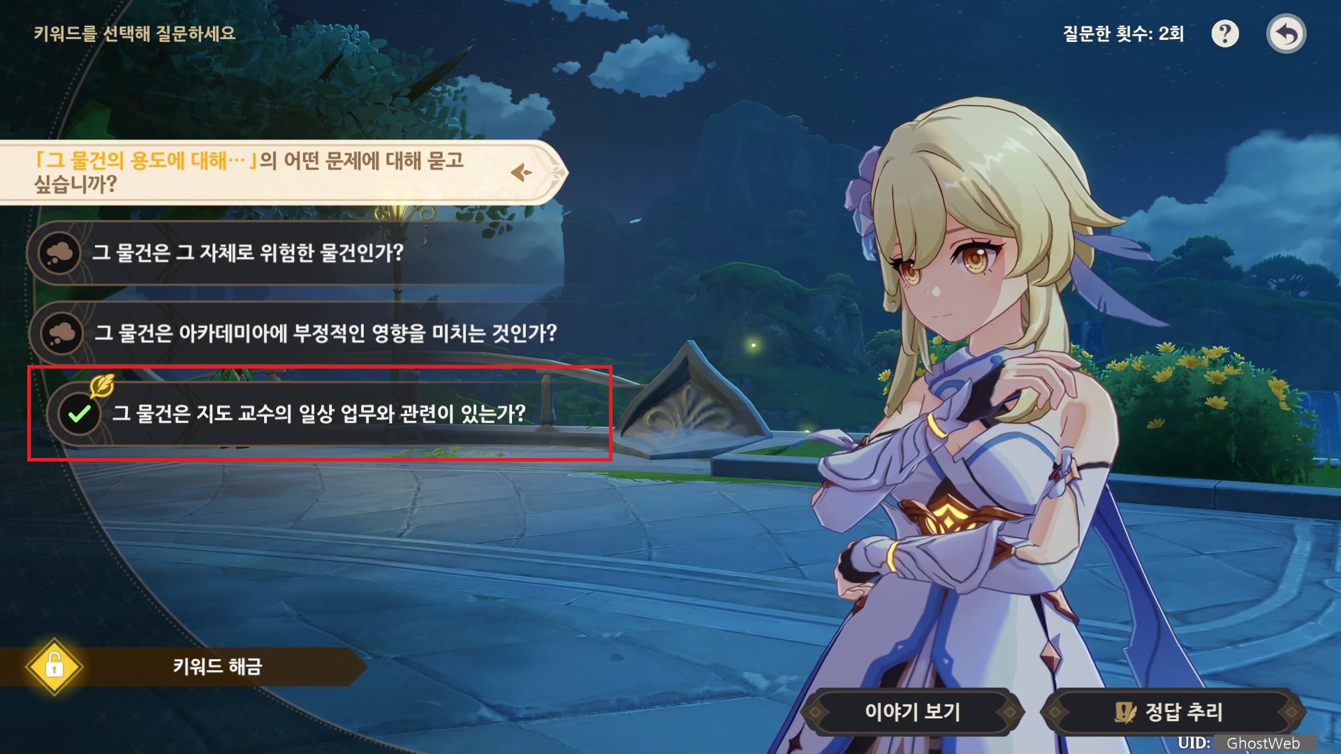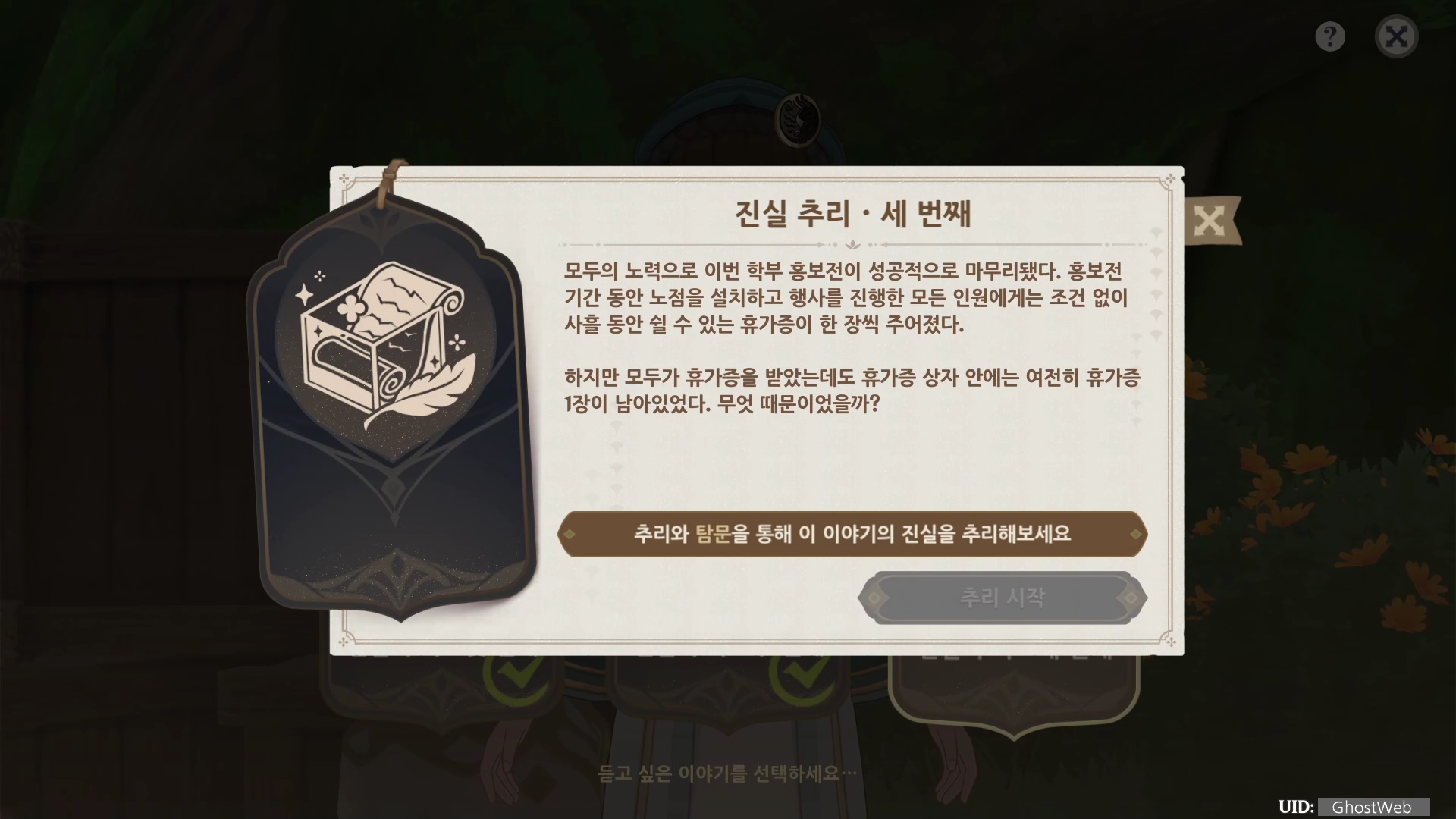해당 이벤트는 바하르의 말을 듣고 질문 내용을 골라 힌트를 유추하여 정답을 추리하는 것으로 힌트 중 중요한 질문을 선택하면 다음 키워드가 해금되어 다른 질문을 할 수 있어요.
