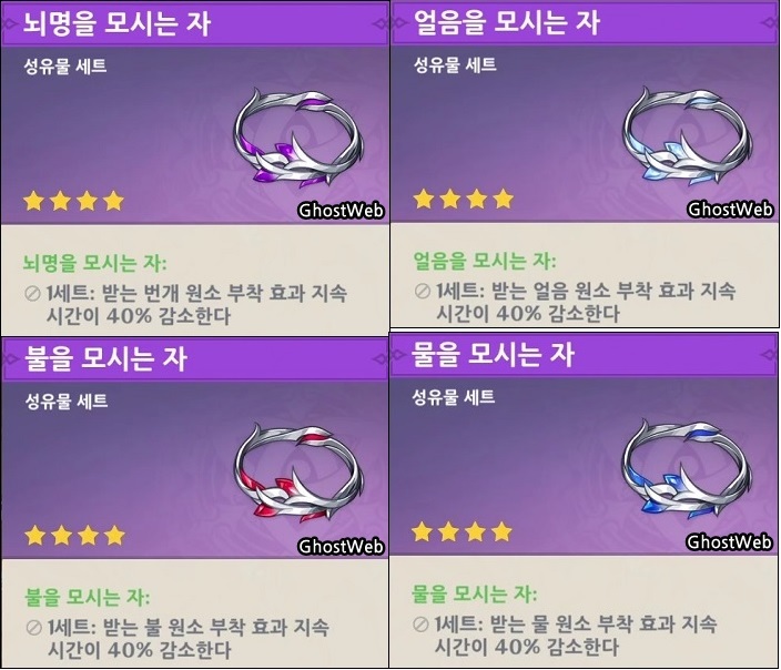 - 번개, 얼음, 불, 물 원소 캐릭터 돌파 소재 : 승리의 자수정, 서늘한 빙옥, 불타오르는 마노, 순수한 청금석
