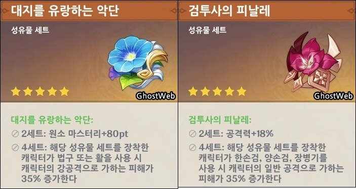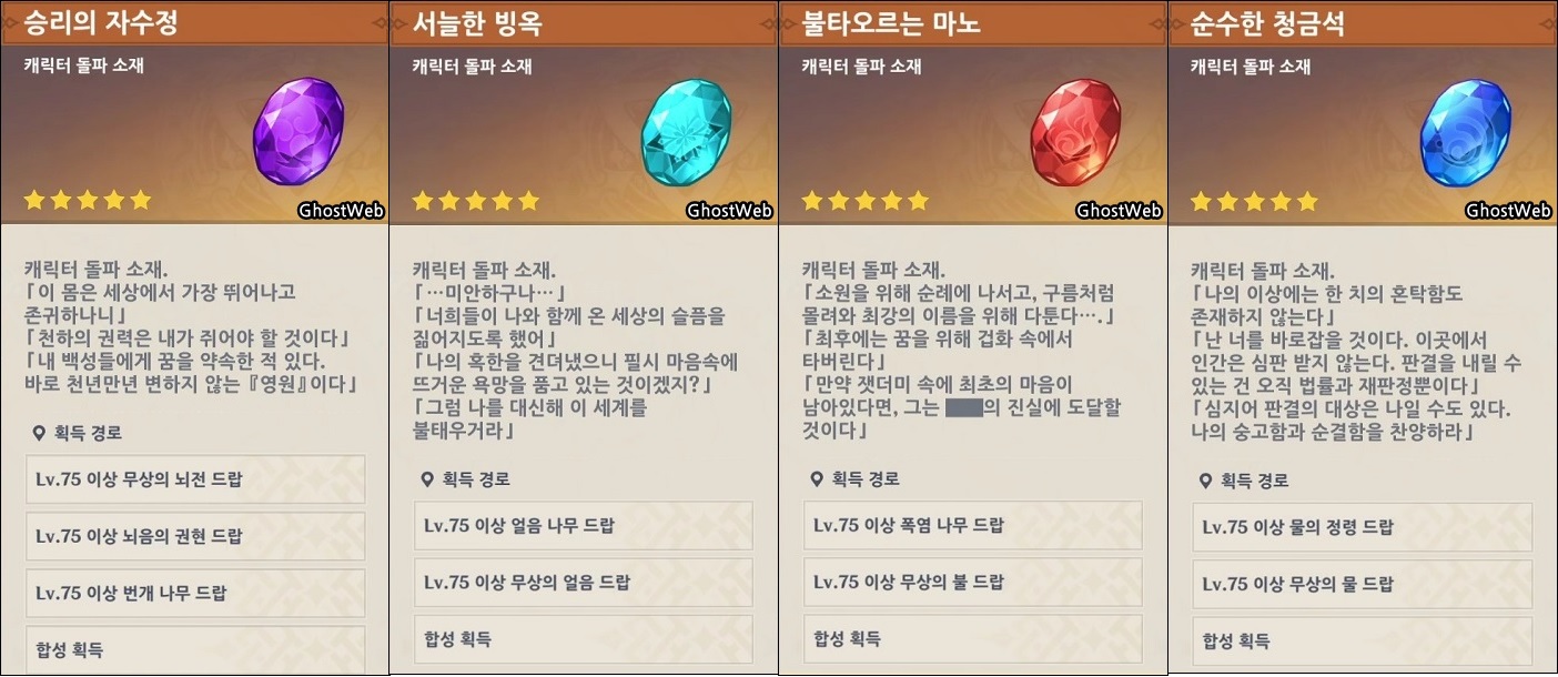 - 번개, 얼음, 불, 물 원소 캐릭터 돌파 소재 : 승리의 자수정, 서늘한 빙옥, 불타오르는 마노, 순수한 청금석