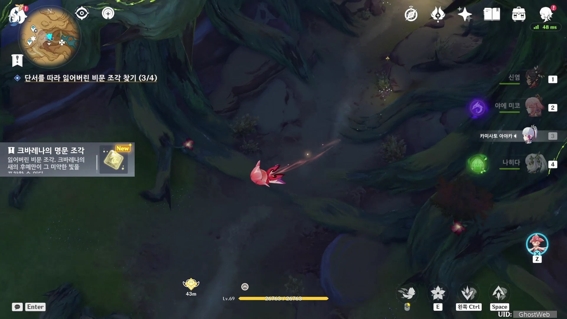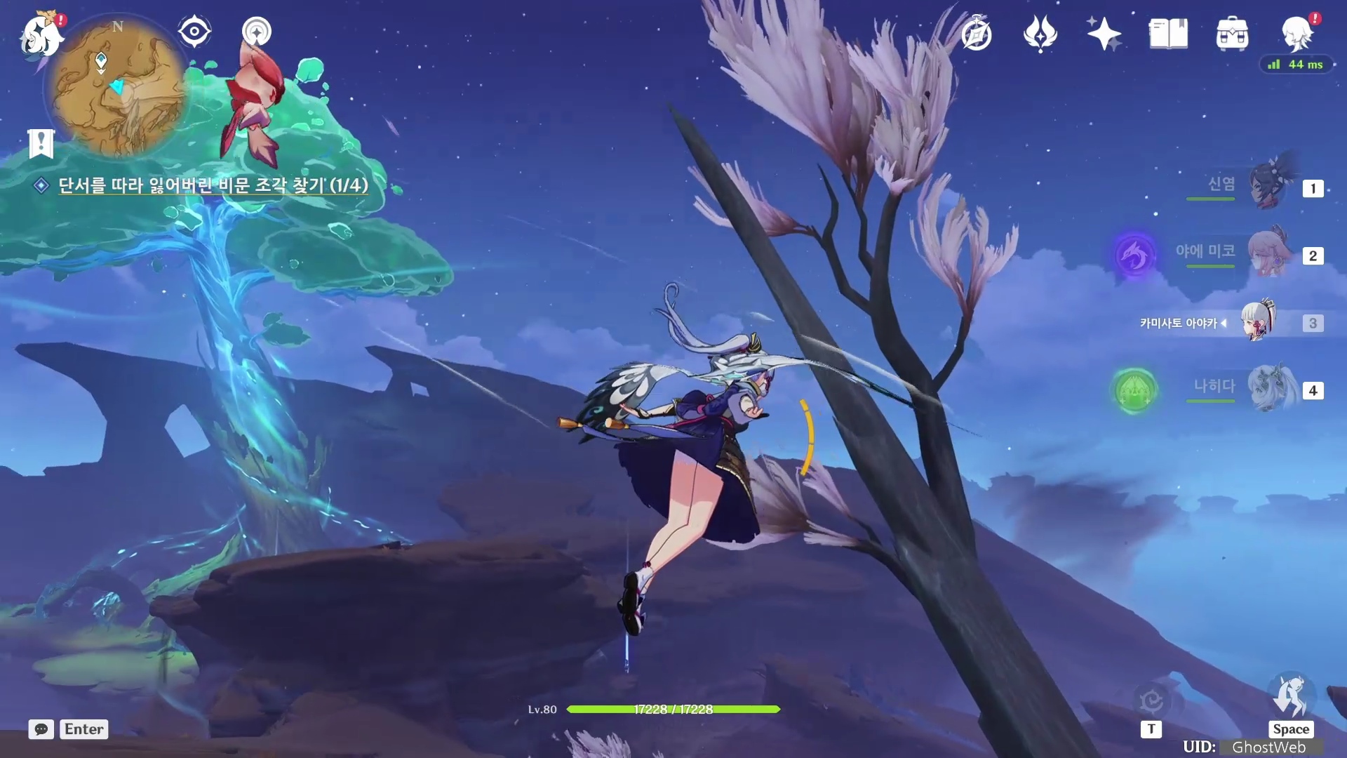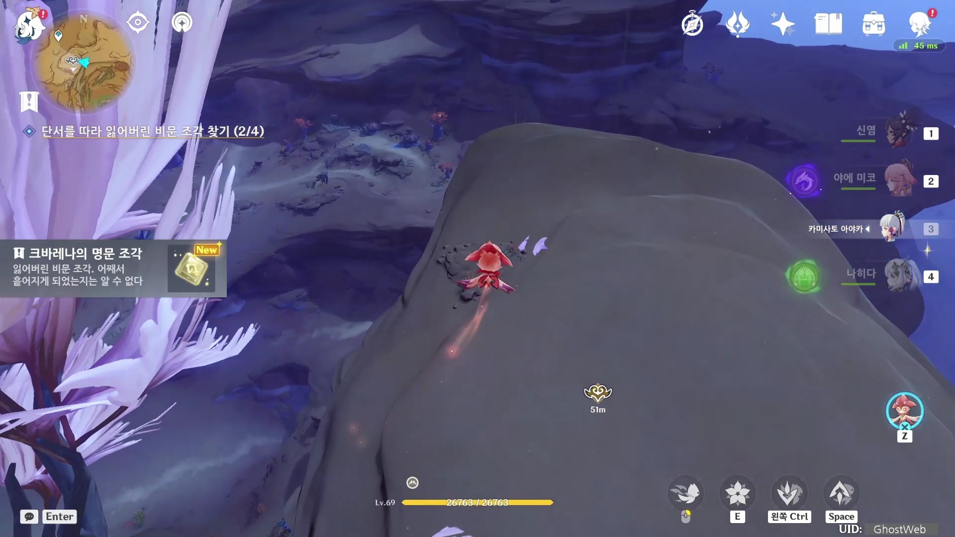 - 투니기 흑연 위쪽의 지상 워프 포인트로 이동하여 언덕 위에 있는 클로버 인장(T키)을 타고 바위 산 꼭대기로 올라가면 투니기 흑연 쪽에 있는 나무 가지를 볼 수 있는데, 그 근처에서 소루쉬로 전환한 다음 나무 위 끝 쪽으로 가면 크바레나의 명문 조각을 얻을 수 있어요.