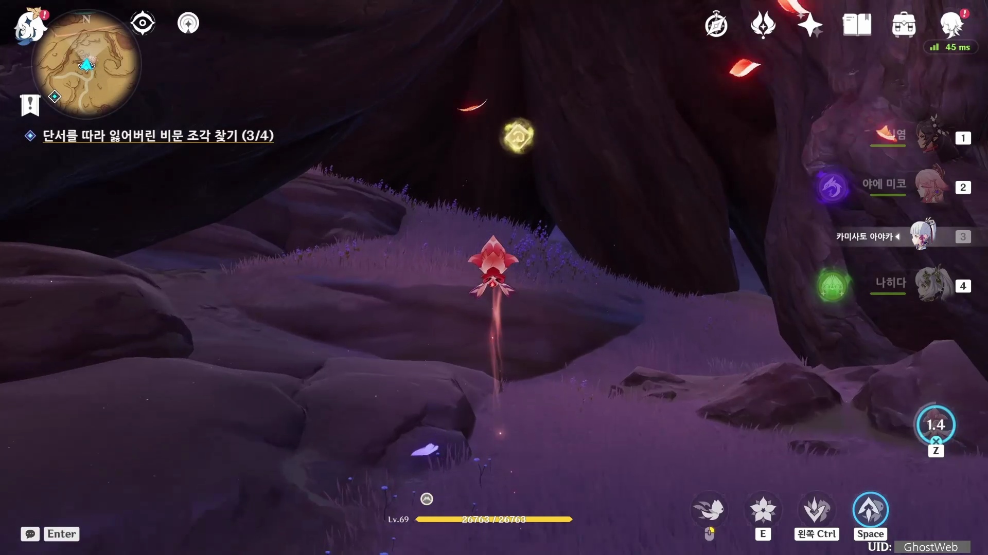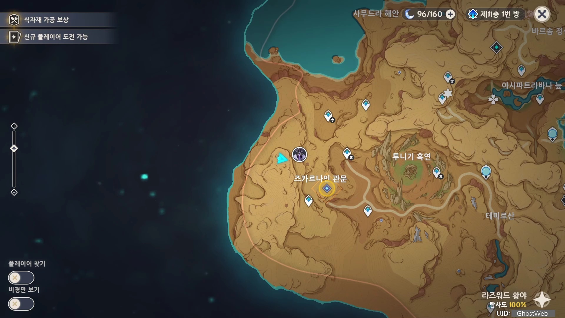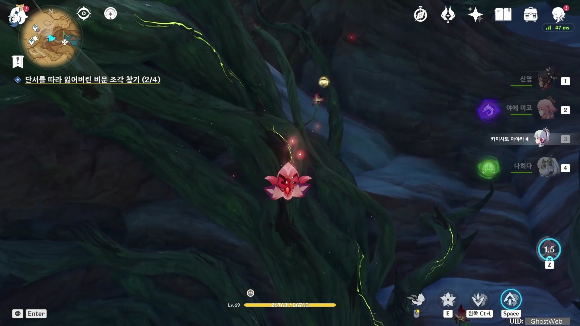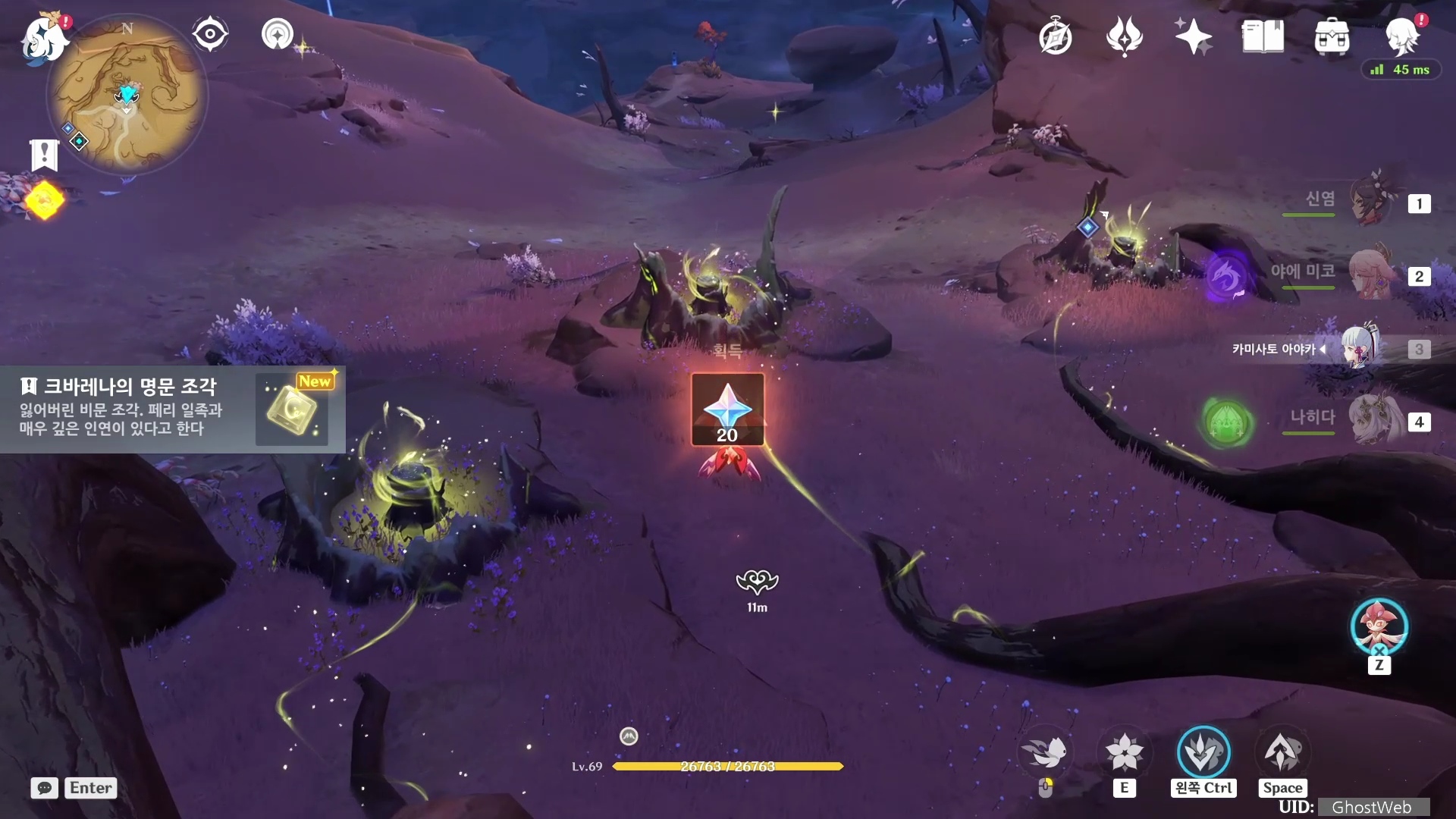 - 투니기 흑연 위쪽의 지상 워프 포인트로 이동하여 언덕 위에 있는 클로버 인장(T키)을 타고 바위 산 꼭대기로 올라가면 투니기 흑연 쪽에 있는 나무 가지를 볼 수 있는데, 그 근처에서 소루쉬로 전환한 다음 나무 위 끝 쪽으로 가면 크바레나의 명문 조각을 얻을 수 있어요.