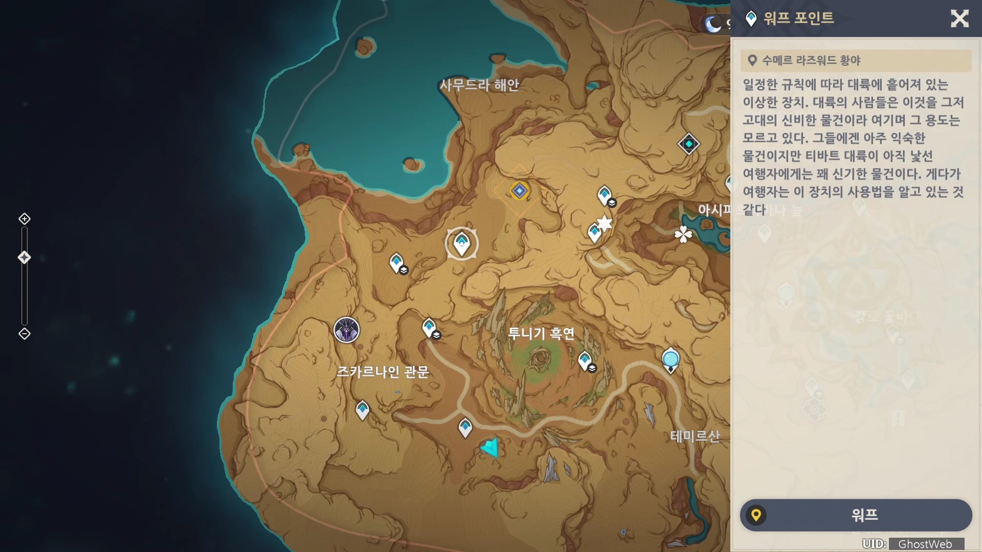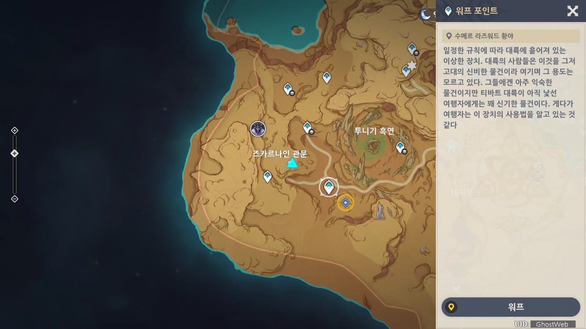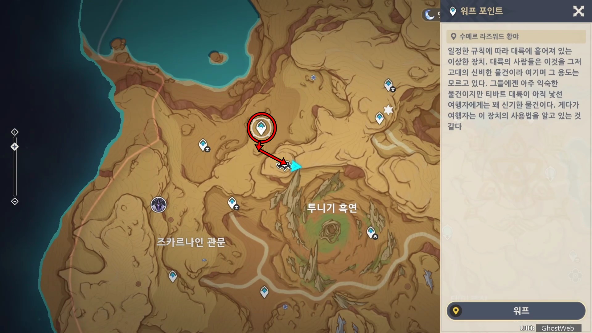 2. 수메르 투니기 흑연 아래쪽 지상에 있는 워프 포인트로 이동하여 근처에 있는 우인단 야영지의 적을 처치하고 야영지 텐트 앞에 있는 [ 누군가의 비망록 ]을 읽으세요.