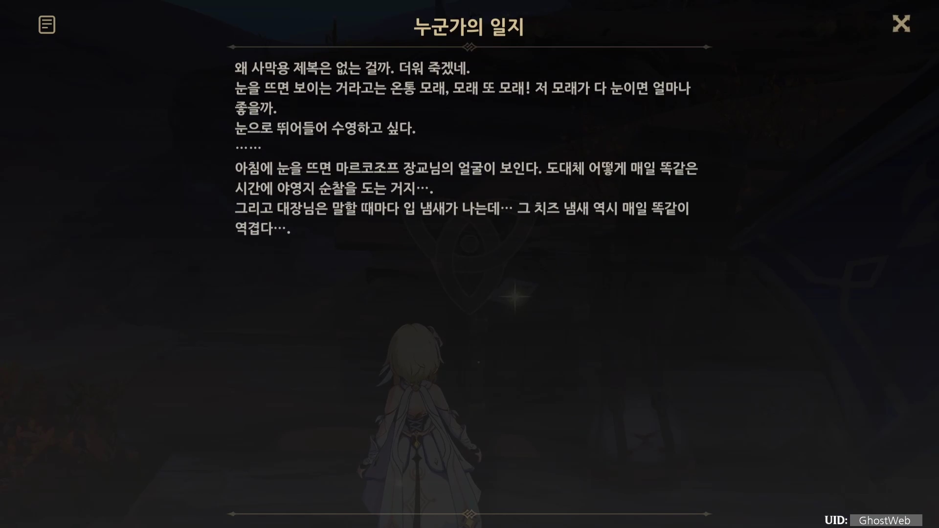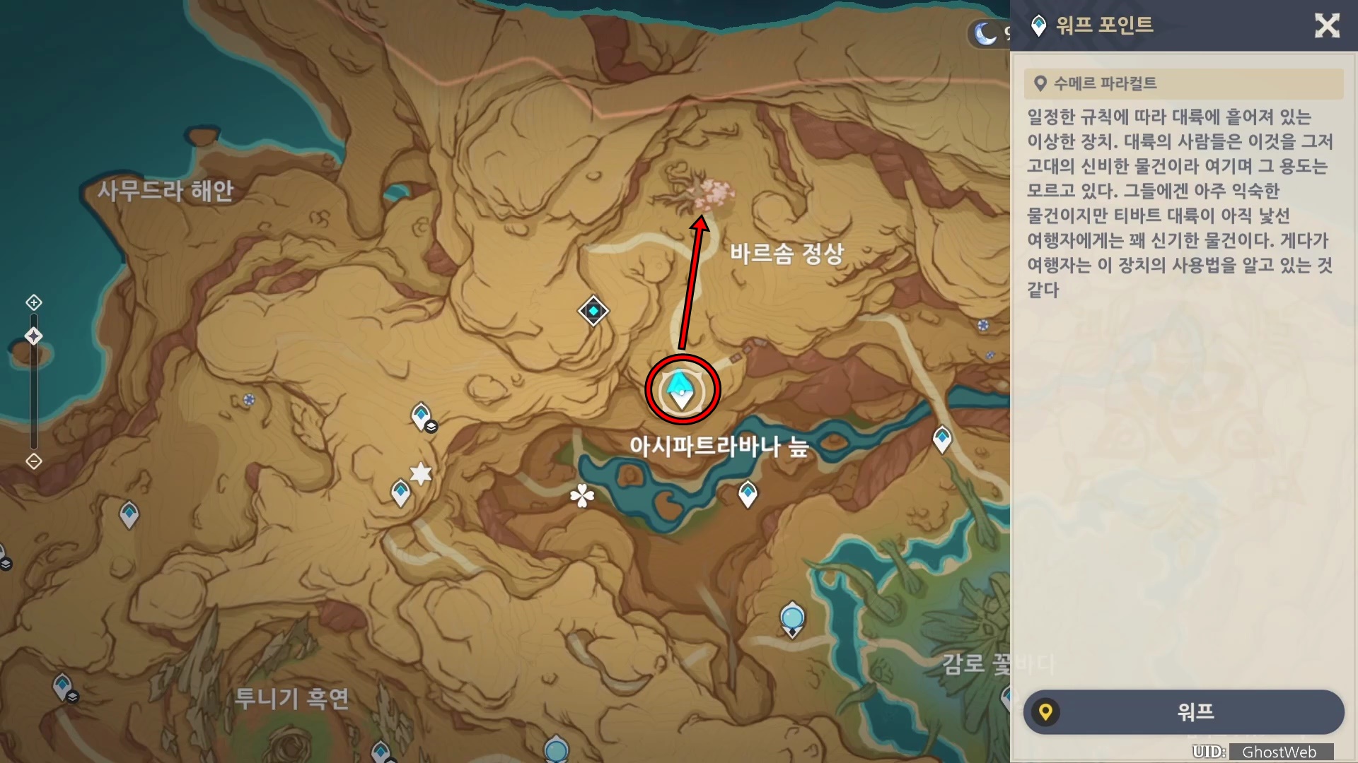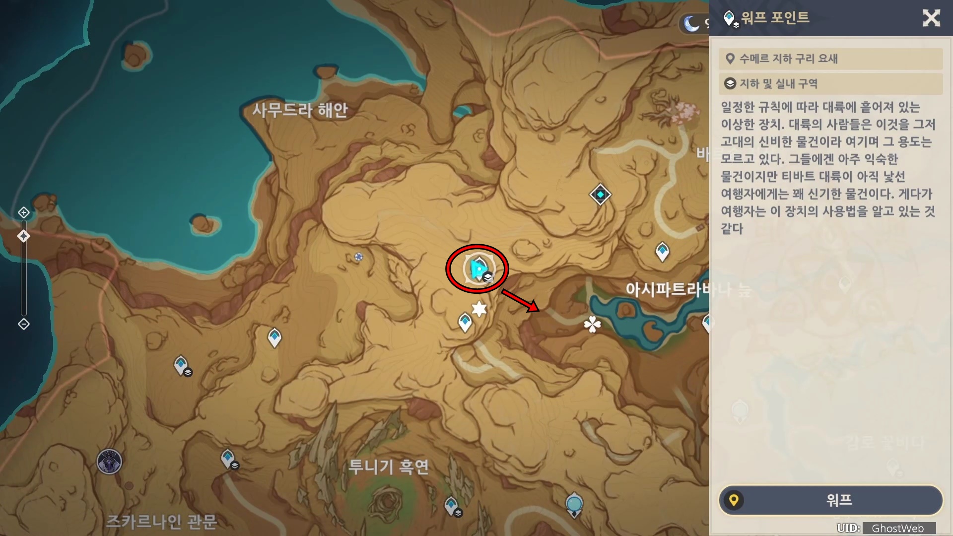 2. 수메르 투니기 흑연 아래쪽 지상에 있는 워프 포인트로 이동하여 근처에 있는 우인단 야영지의 적을 처치하고 야영지 텐트 앞에 있는 [ 누군가의 비망록 ]을 읽으세요.
