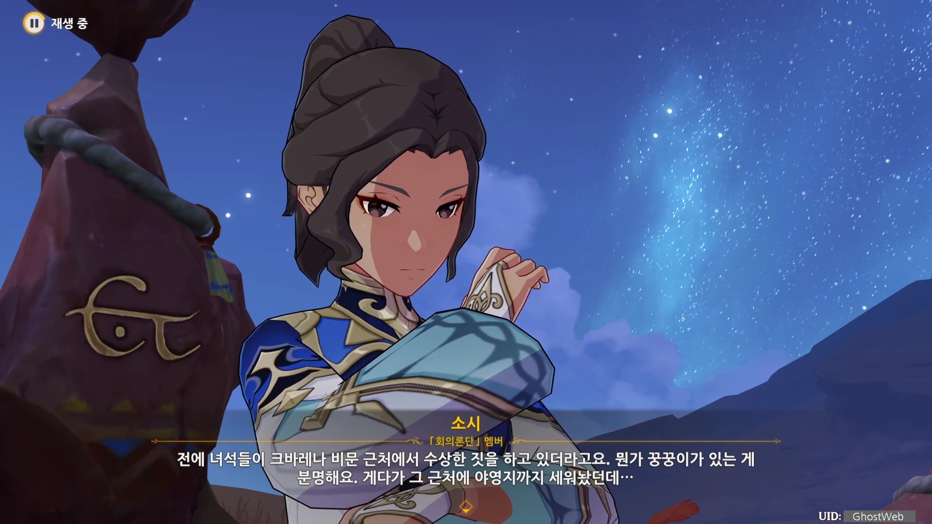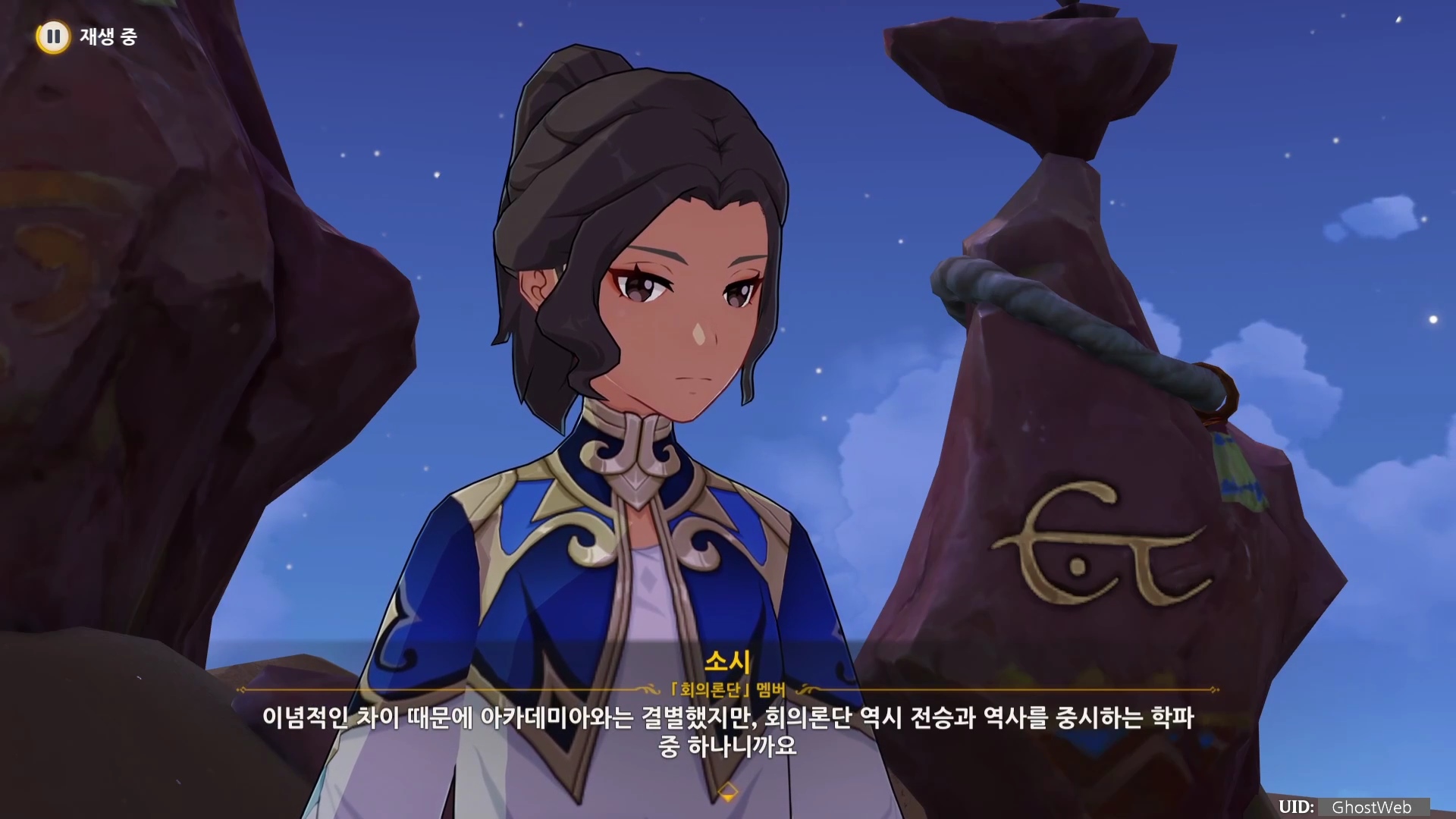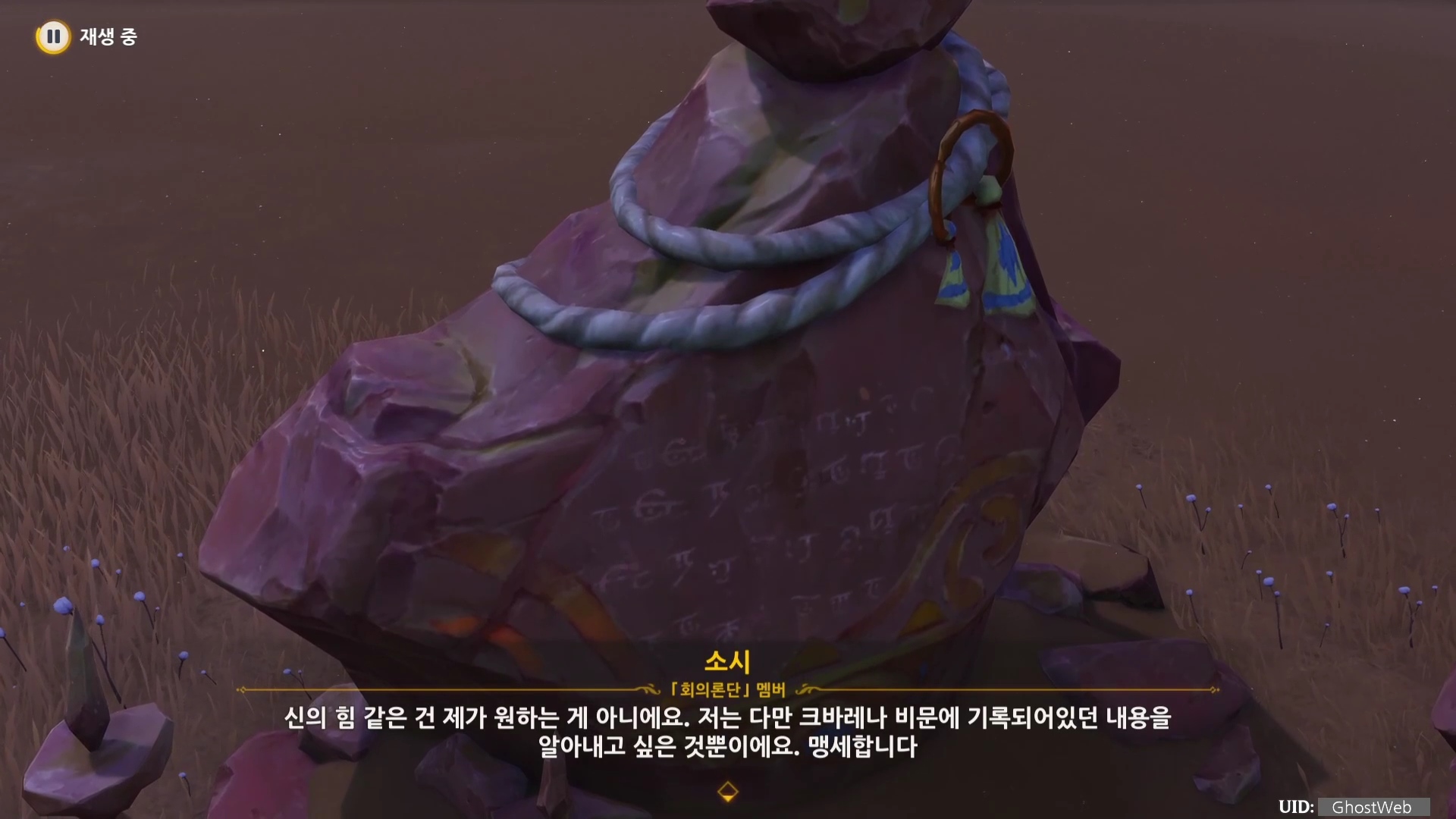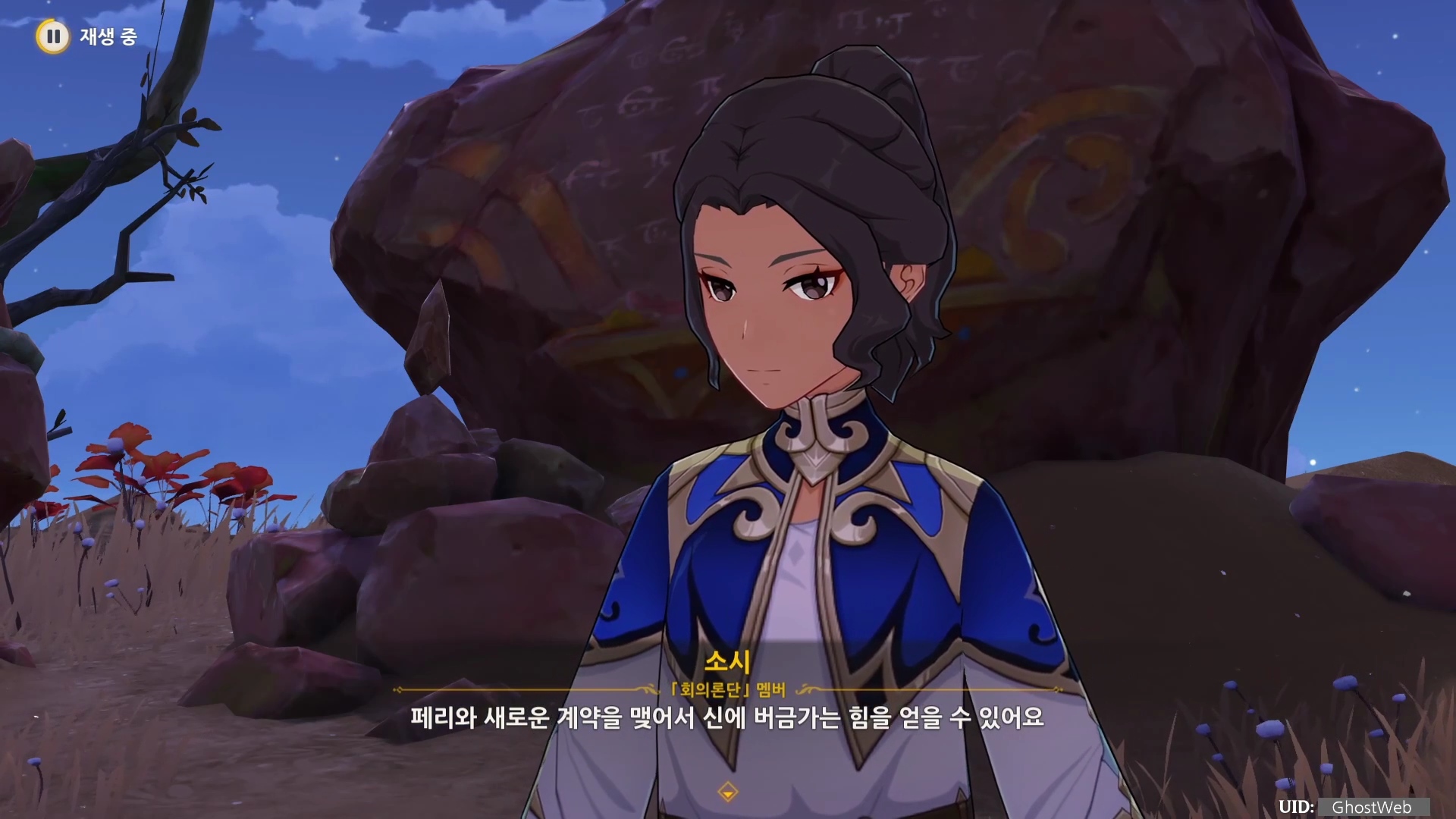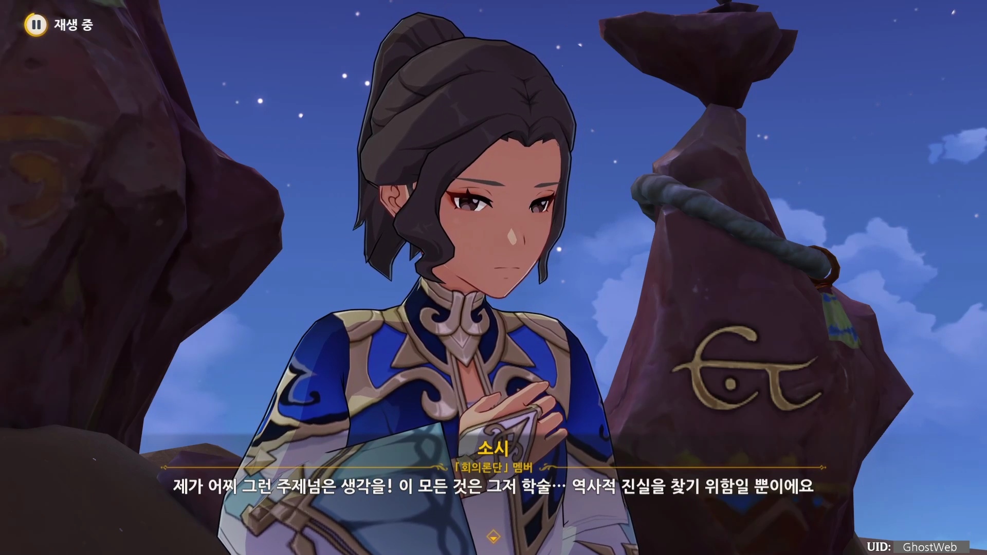 테미르산 근처 야영지에 있는 소시(회의론단 멤버)에게 말을 걸면 임무를 진행할 수 있는데, 소시와 함께 크바레나 비석을 보고 소시는 역사적 학술을 위해 여행자와 소루쉬에게 비문을 노리고 있는 우인단 처치와 4개의 비문을 찾아 달라고 해요.