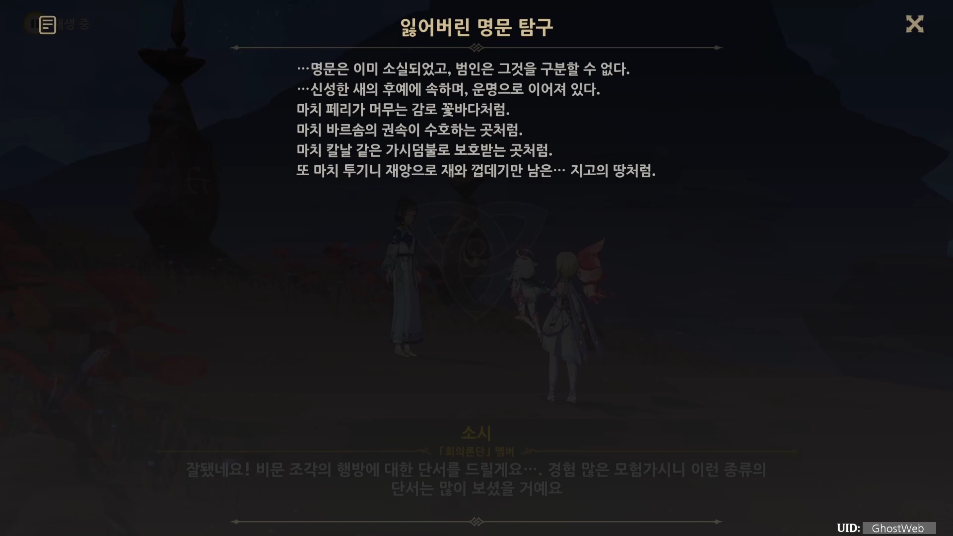 이번에는 원신 3.6 버전 신규 월드 임무인 비문 연구와 비문 조각 4개의 위치를 정리해보도록 할게요.