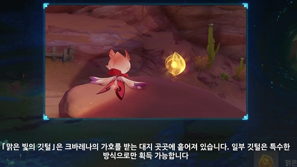 맑은 빛의 깃털이 근처에 있을 경우 미니맵에도 표시되며, 맑은 빛의 깃털을 얻기 위해서는 소루쉬 장착하면 맑은 빛의 깃털 근처에서 소루쉬로 전환하여 E키를 눌러 해당하는 서브 임무을 진행하면 얻을 수 있어요.