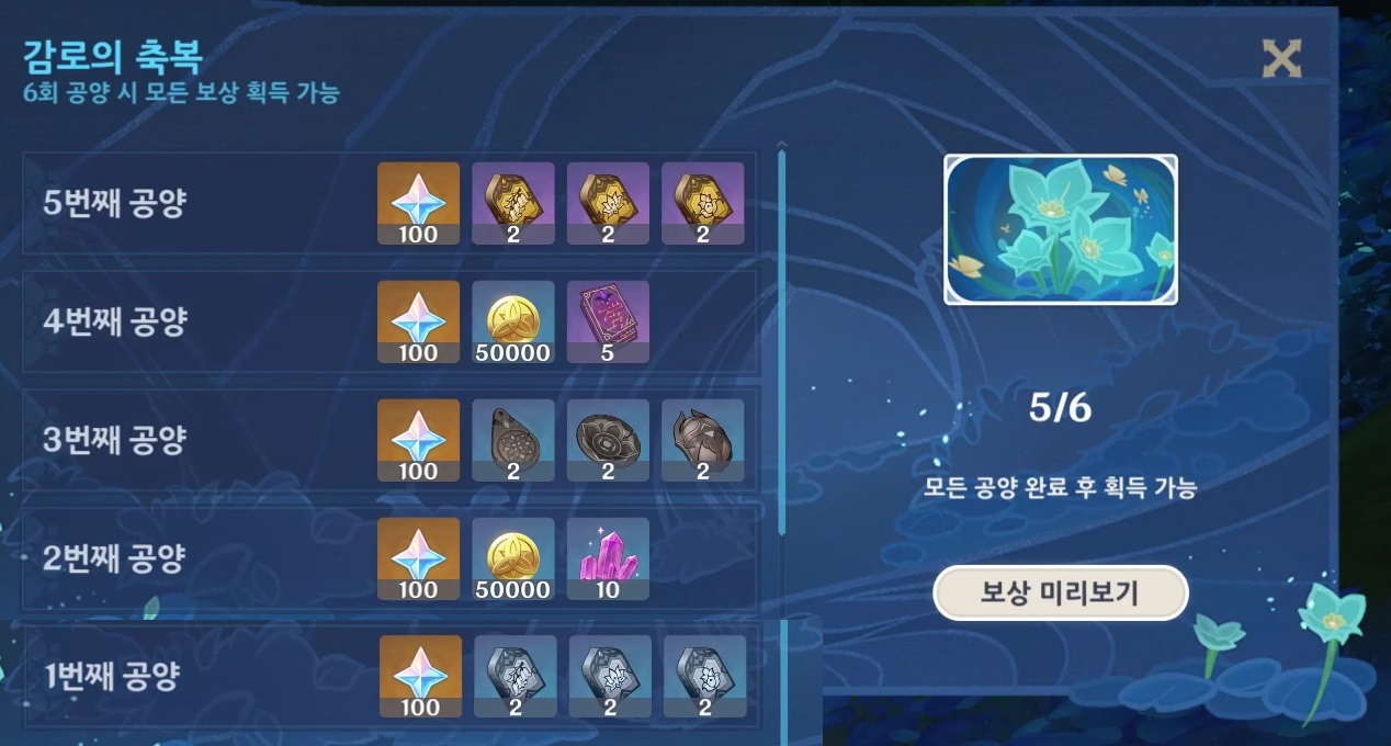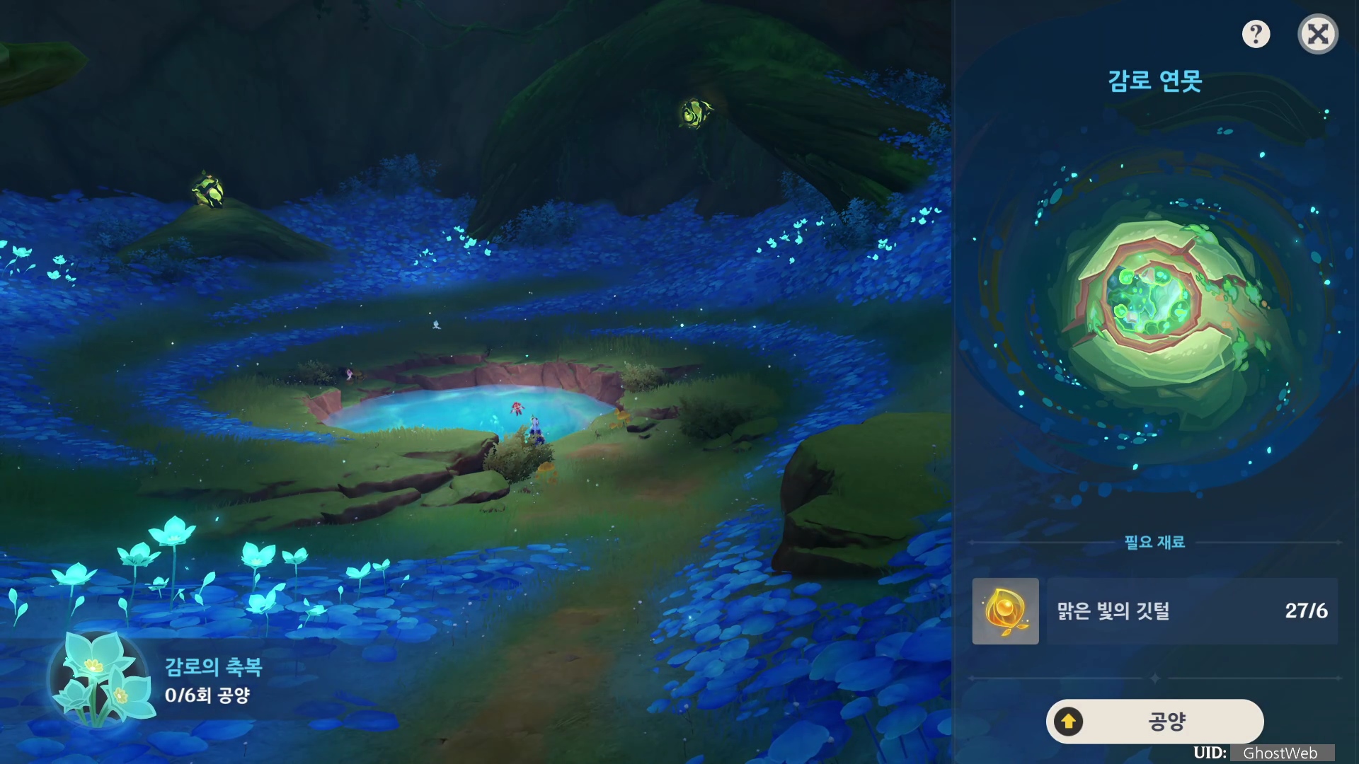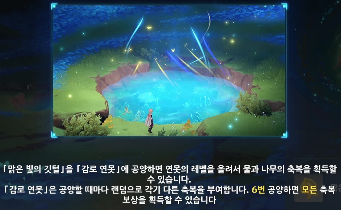 맑은 빛의 깃털을 모아 감로 꽃바다 왼쪽 아래에 있는 [ 감로 연못 ]에 공양을 하면 원석, 캐릭터 육성 소재 등을 얻을 수 있어요.