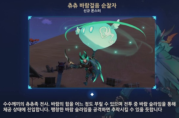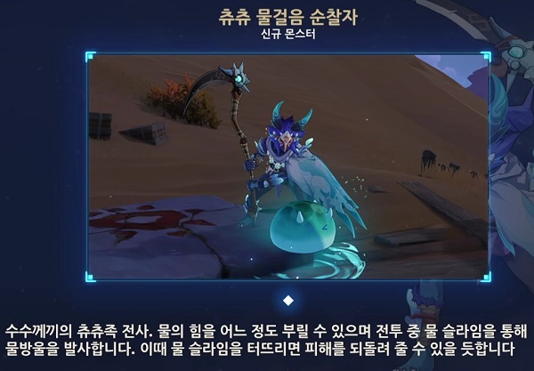 츄츄 물/바람걸음 순찰자는 물/바람 슬라임을 소환해 합동 공격을 하는데 슬라임을 터트리면 순찰자를 그로기(락 다운) 상태를 만들 수 있어요.
