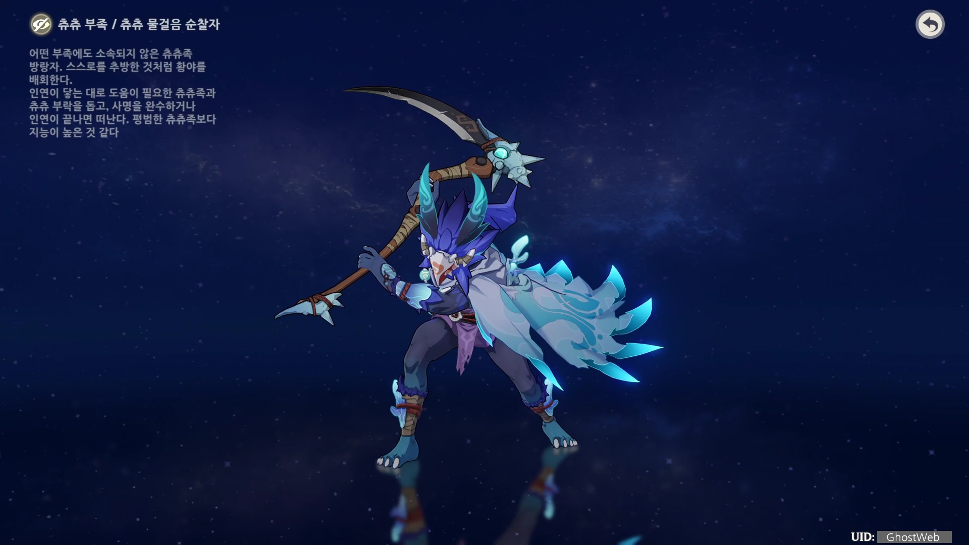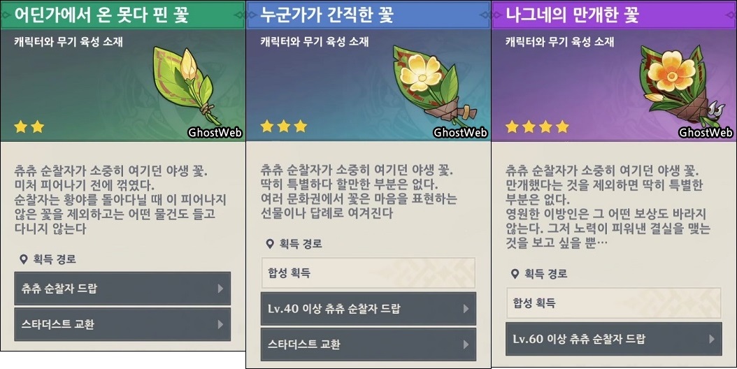 츄츄 물, 바람 걸음 순찰자를 처치하면 캐릭터, 무기 육성 소재인 어딘가에서 온 못다 핀 꽃, 누군가가 간직한 꽃, 나그네의 만개한 꽃을 파밍할 수 있어요.