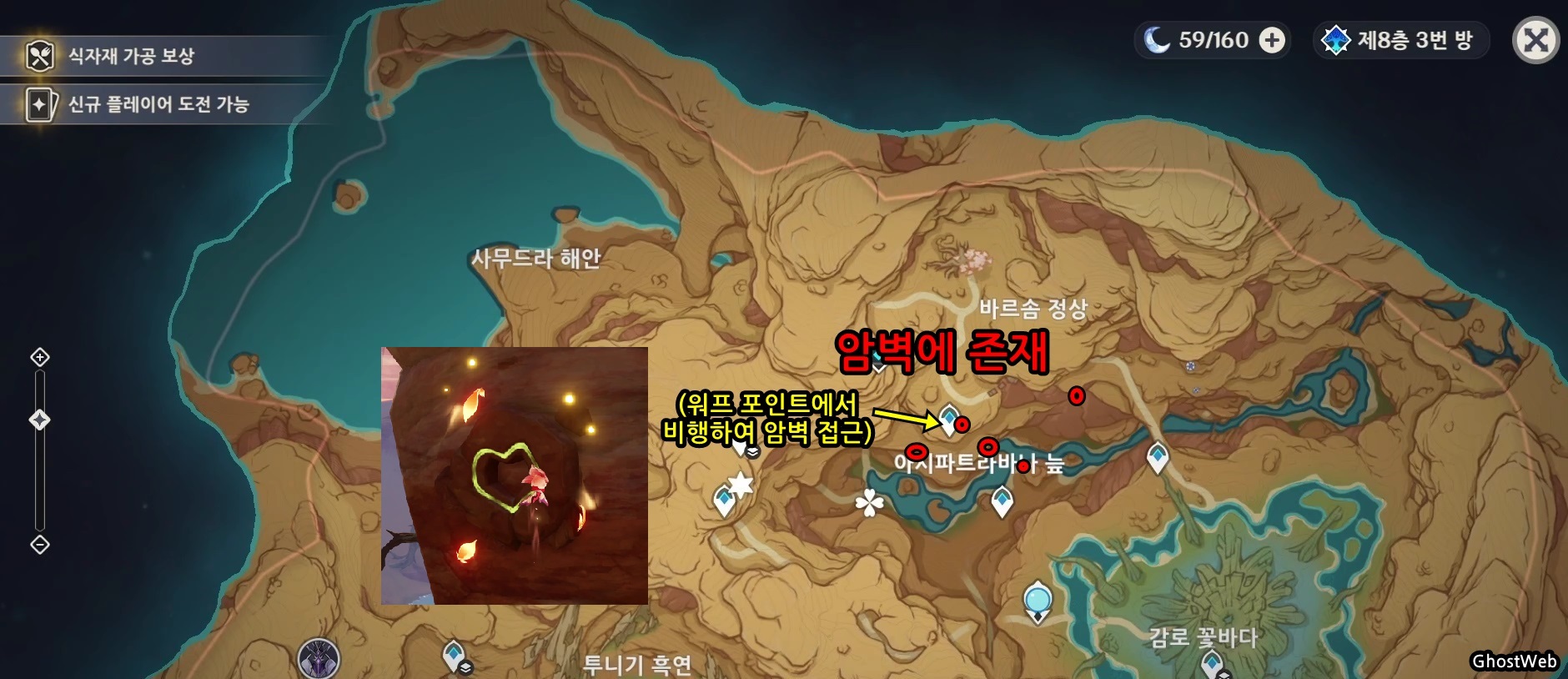 지도에서 아시파트라바나 늪이라고 글자가 있는 곳 위에 있는 워프 포인트에서 비행하여 암벽에 있는 문양에 접근하는 것이 편해요. (문양 위 층에 캐릭터 두고 소루쉬로 전환하여 꽃을 피고 캐릭터로 내려오기)