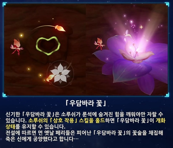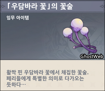 보물상자와 맑은 빛의 깃털을 얻을 수 있는 영혼이 깃든 나무를 진행하다 보면 나무의 잔재 영혼(페리)가 우담바라 꽃의 꽃술을 가져와달라고 하는데, 아시파트라바나 늪에서 우담바라 꽃의 꽃술 3개를 얻어 갖다 주면 돼요.
