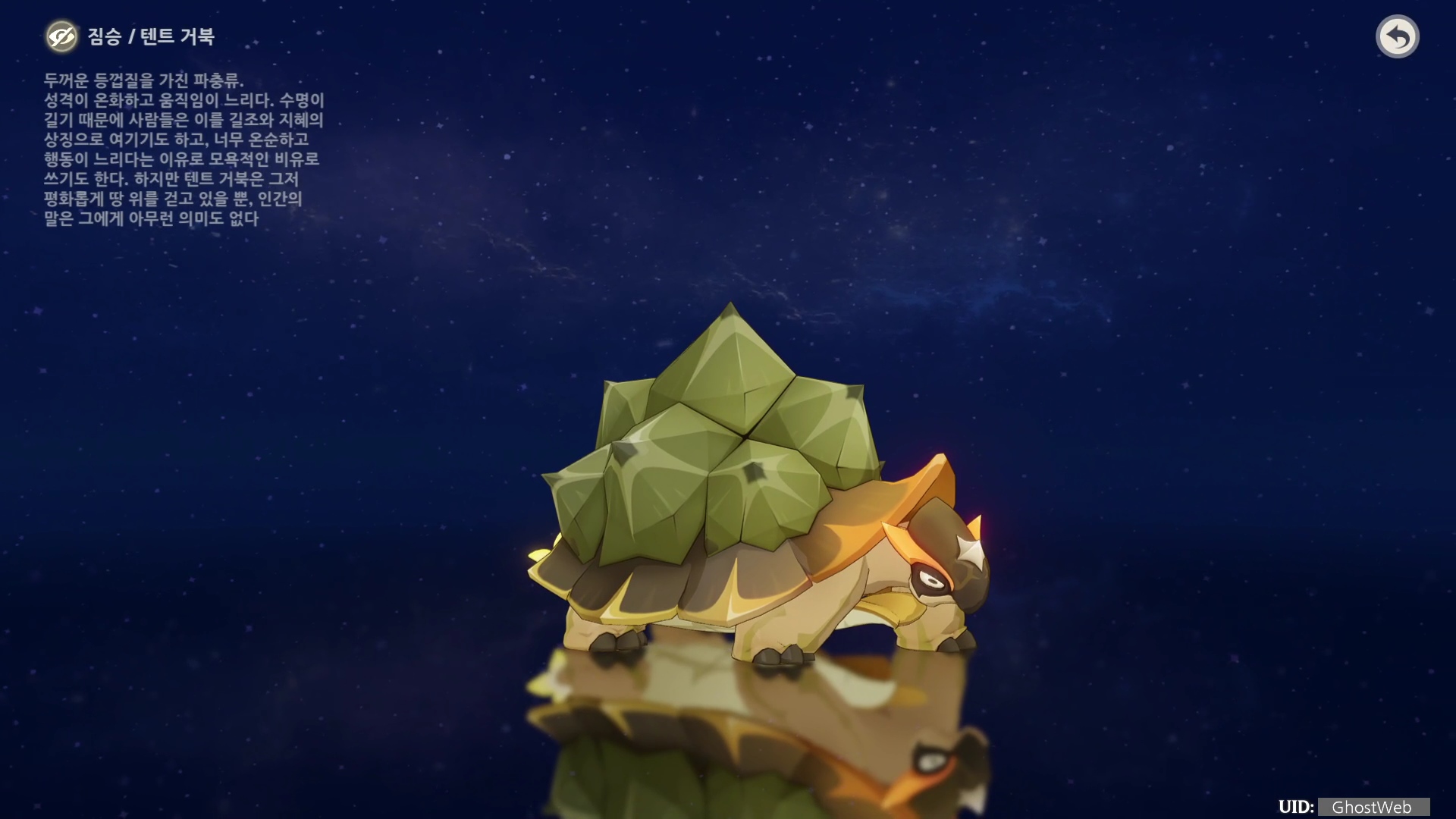 - 강가, 바닷가 등에 나오는데 3.6 버전 현재 무적이라 잡을 수 없는 동물로 공격을 통해 원소 에너지밖에 모으지 못하는 동물로 이후 버전에 어떻게 쓰일지 궁금하네요.