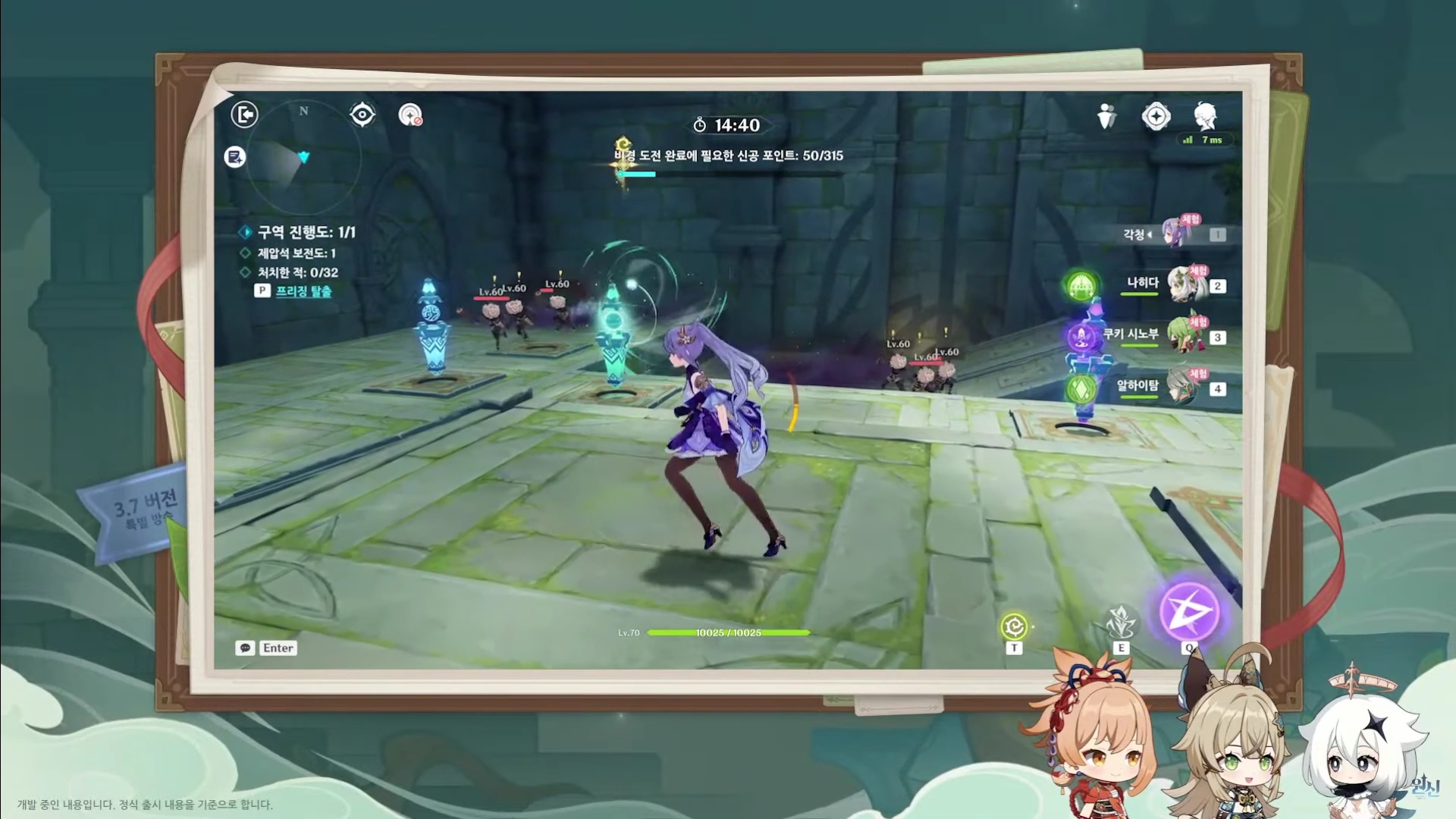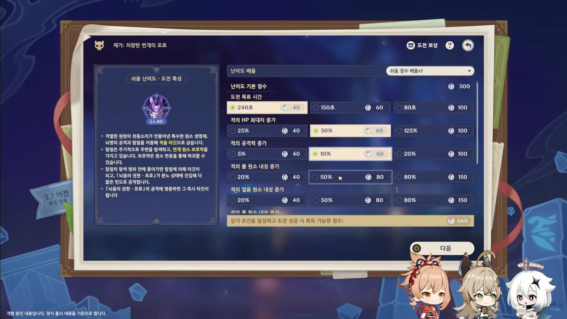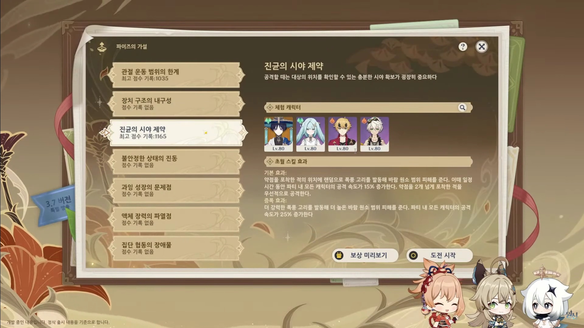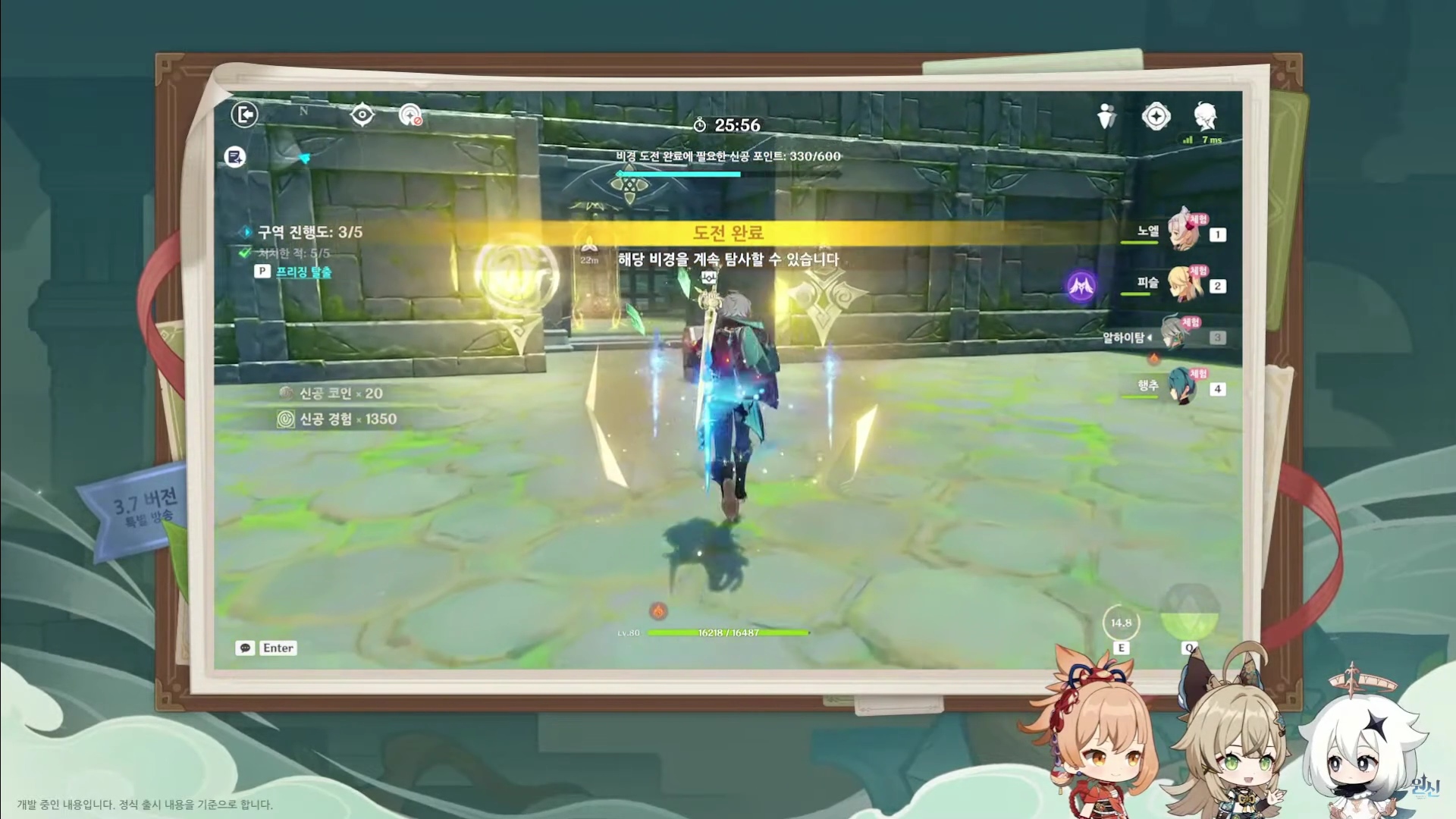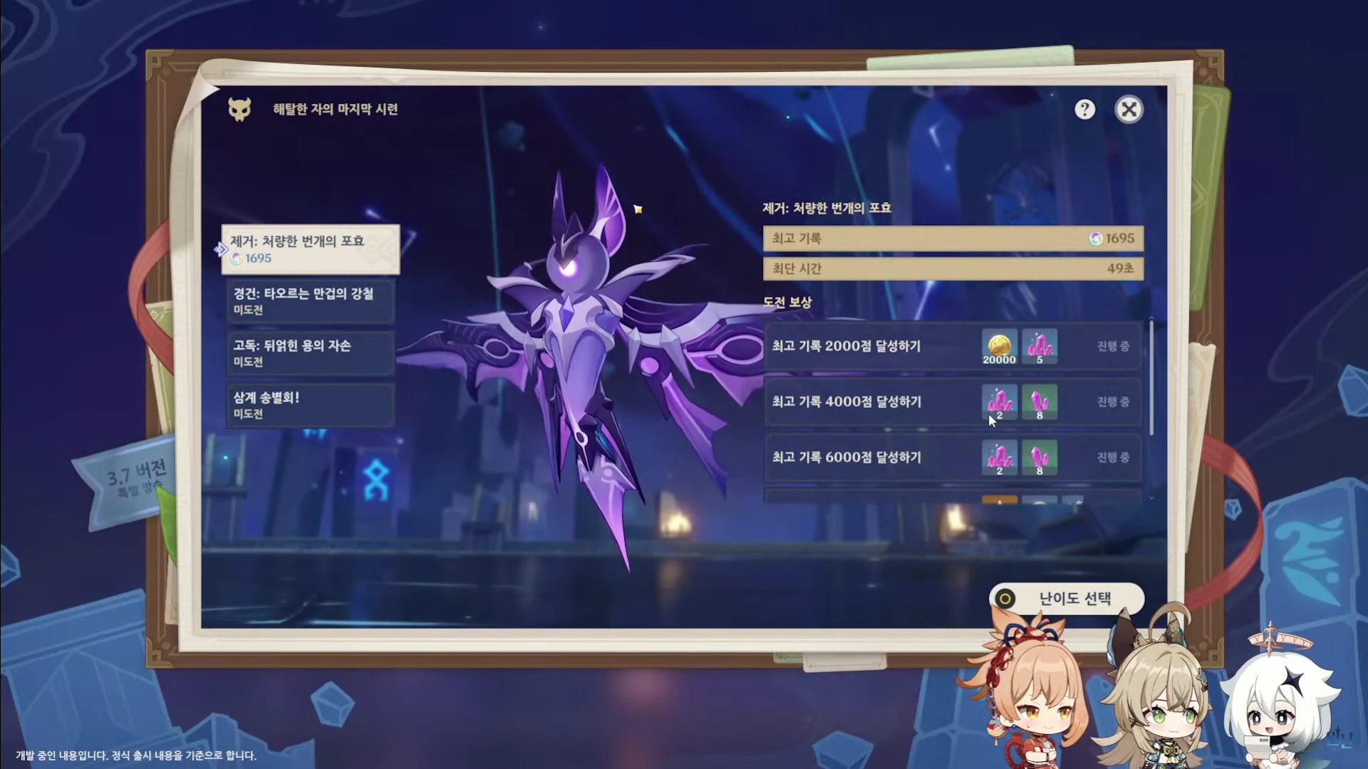 - 보상 : 원석, 캐릭터 돌파 소재, 무기 강화 소재, 정제용 마법 광물, 캐릭터 경험 소재, 모라