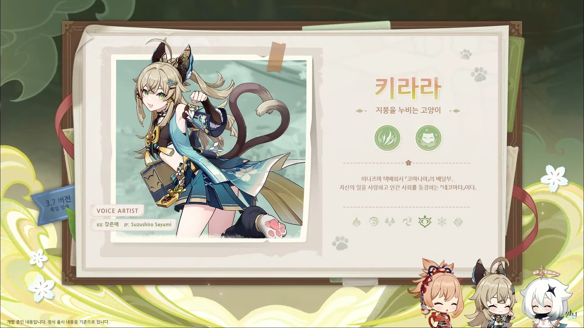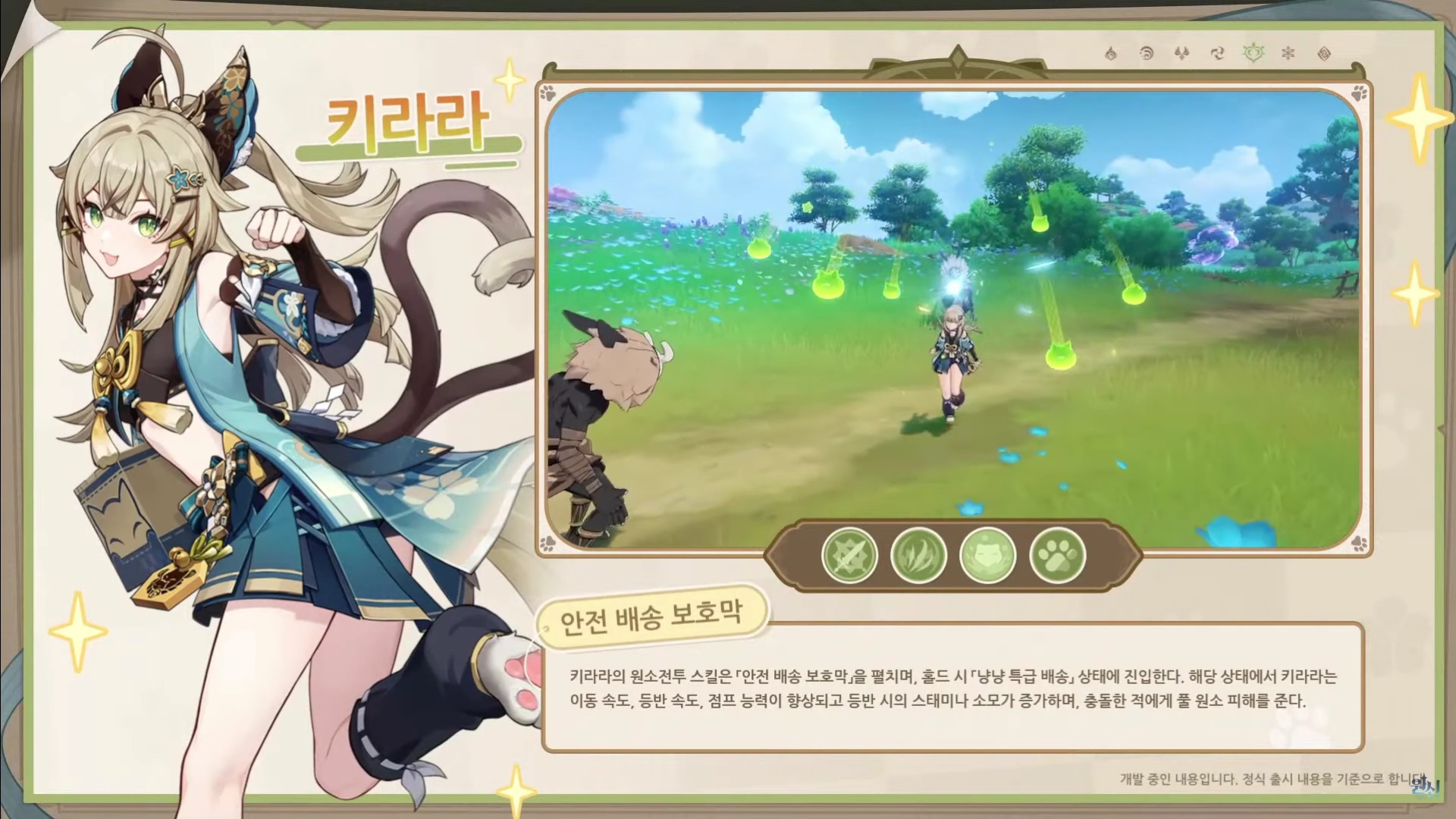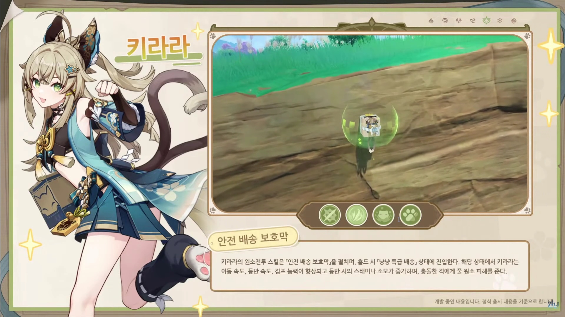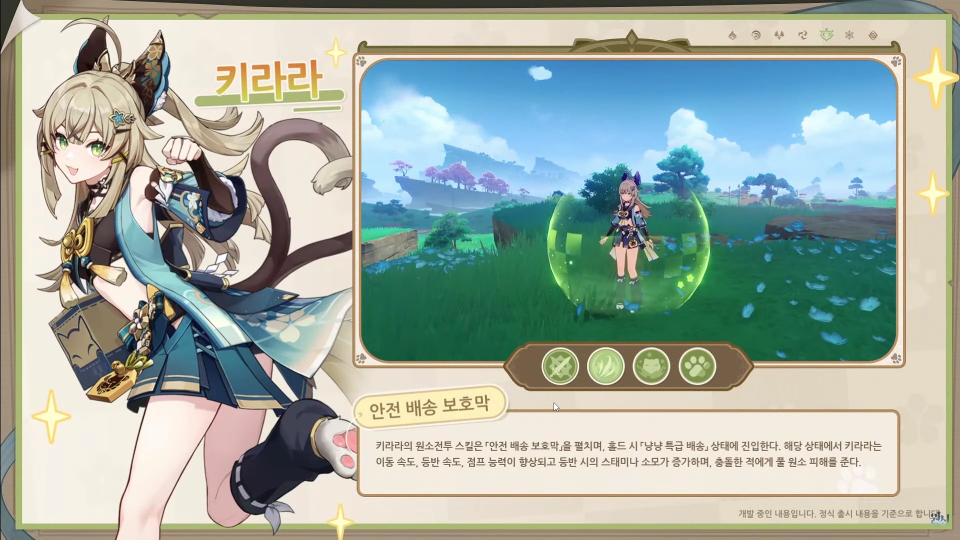 - 키라라의 원소전투 스킬은 [안전 배송 보호막]을 펼치며, 홀드 시 [냥냥 특급 배송] 상태에 진입한다.