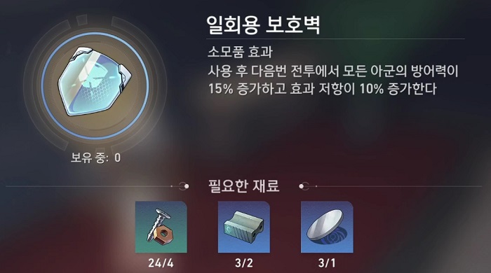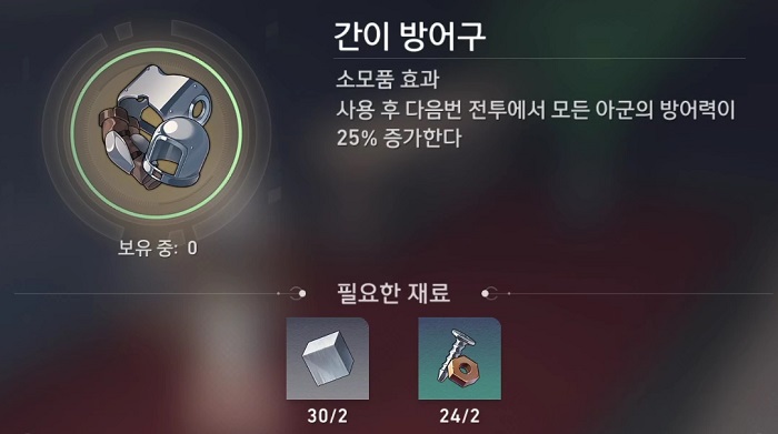 - 사용 후 다음번 전투에서 모든 아군의 방어력이 25% 증가한다.