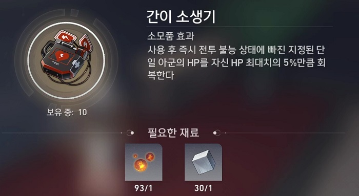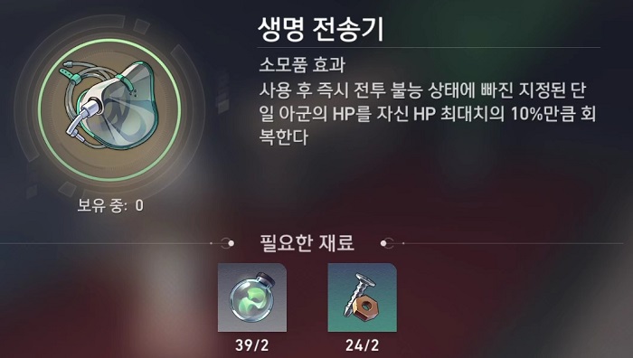 - 사용 후 즉시 전투 불능 상태에 빠진 지정된 단일 아군의 HP 최대치의 5%만큼 회복한다.