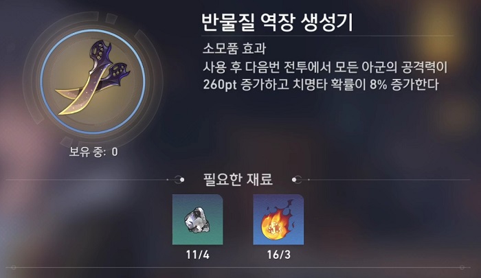 - 사용 후 다음번 전투에서 모든 아군의 공격력이 260pt 증가하고 치명타 확률이 8% 증가한다.