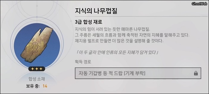 - 재료 : 플로지스톤 4개, 가상 입자 2개, 지식의 나무껍질 2개