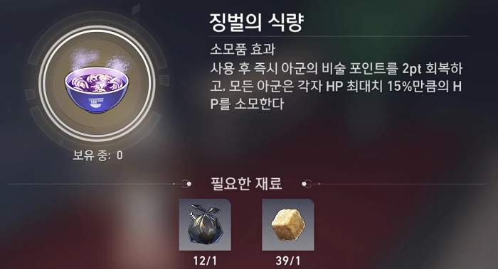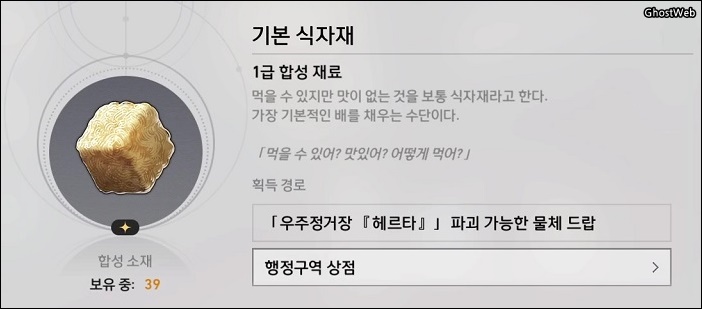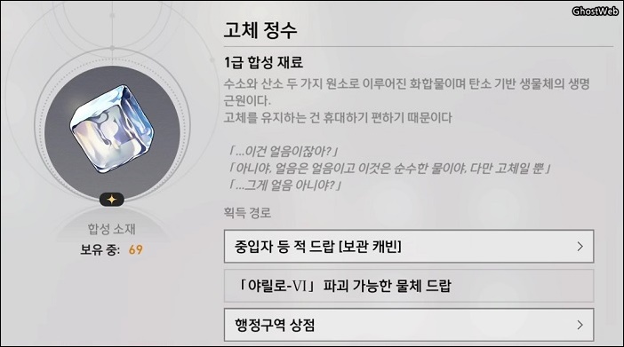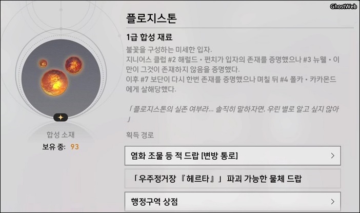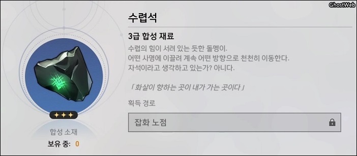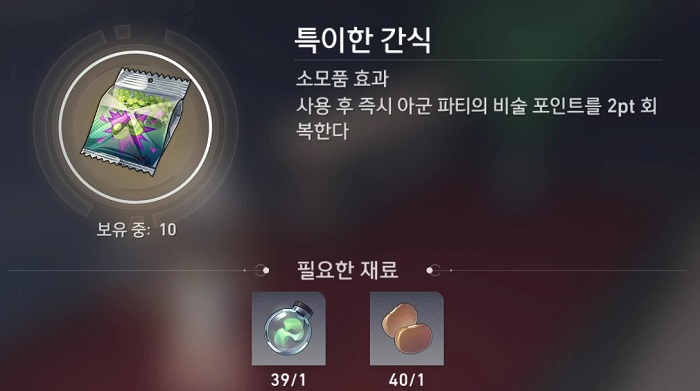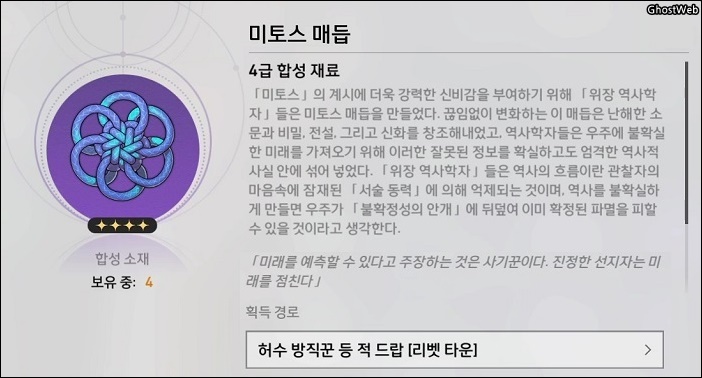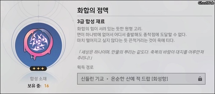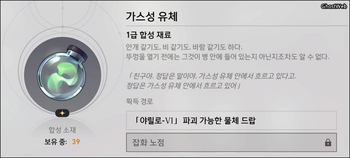 - 재료 : 가스성 유체 6개, 수렵석 2개, 화합의 점액 3개, 미토스 매듭1개