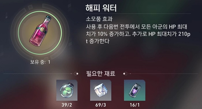 - 사용 후 다음번 전투에서 모든 아군의 HP 최대치가 10% 증가하고, 추가로 HP 최대치가 210pt 증가한다.