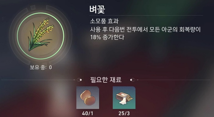 - 사용 후 다음번 전투에서 모든 아군의 회복량이 18% 증가한다.