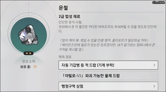 - 재료 : 운철 4개, 파멸의 이물질 3개