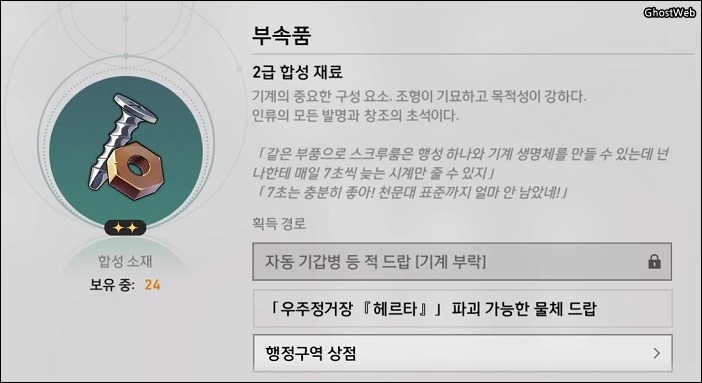 - 재료 : 부속품 4개, 보존의 건축 자재 2개, 공허의 파편 1개