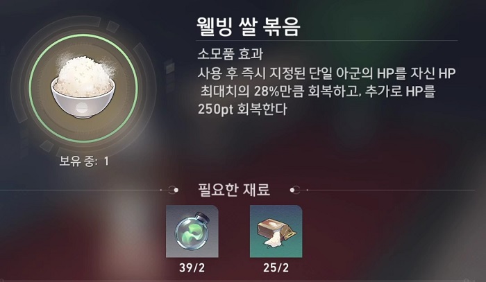 - 사용 후 즉시 지정된 단일 아군의 HP를 자신 HP 최대치의 28%만큼 회복하고, 추가로 HP를 250pt 회복한다.