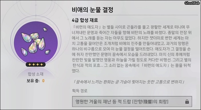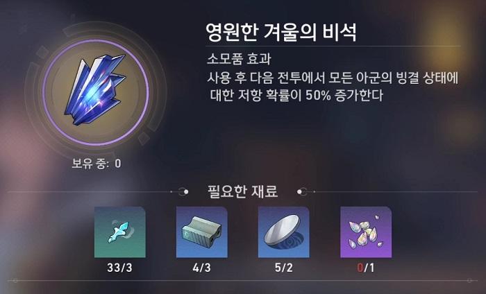 - 재료 : 얼음 코어 3개, 보존의 건축 자재 3개, 공허의 파편 2개, 비애의 눈물 결정 1개