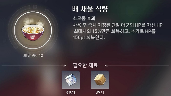 - 사용 후 즉시 지정된 단일 아군의 HP를 자신 HP 최대치의 15%만큼 획복하고, 추가로 HP 150pt 회복한다.