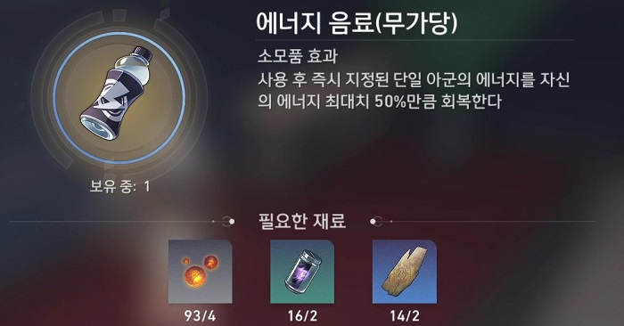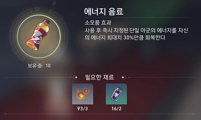 - 사용 후 즉시 지정된 단일 아군이 에너지를 자신의 에너지 최대치 30%만큼 회복한다.