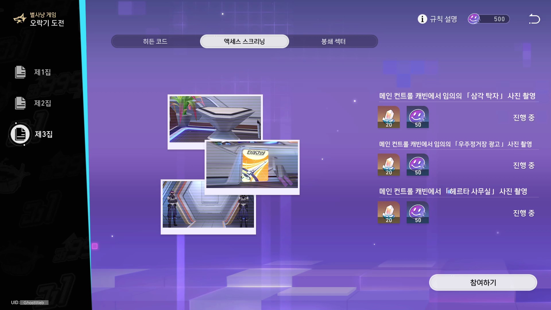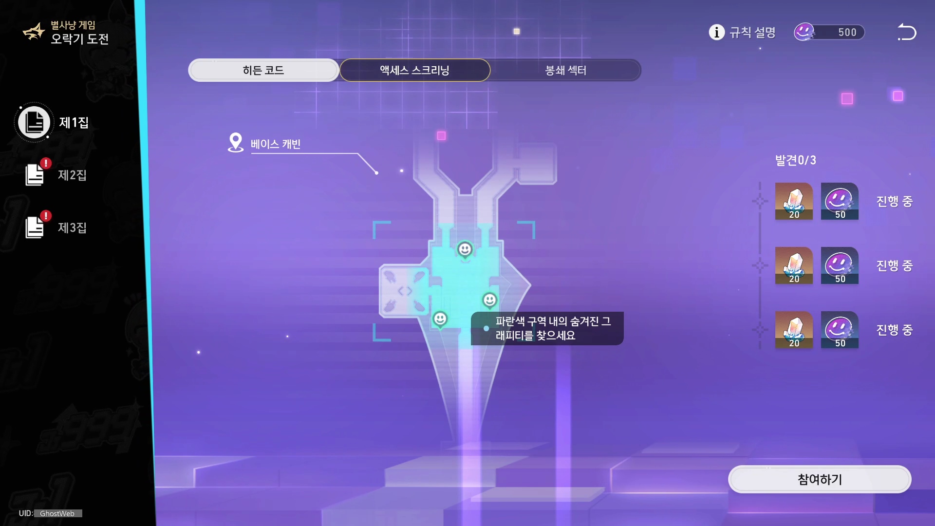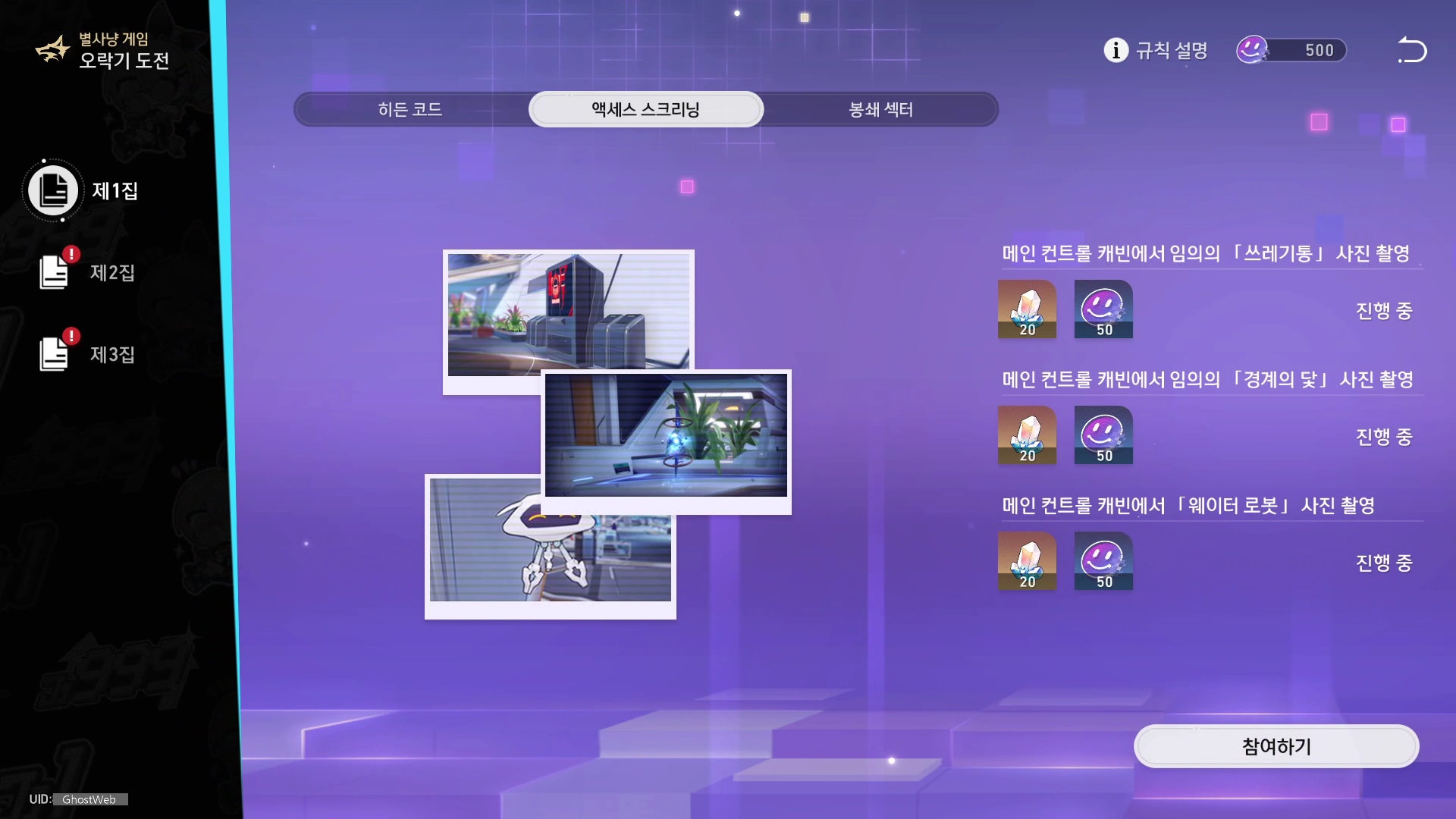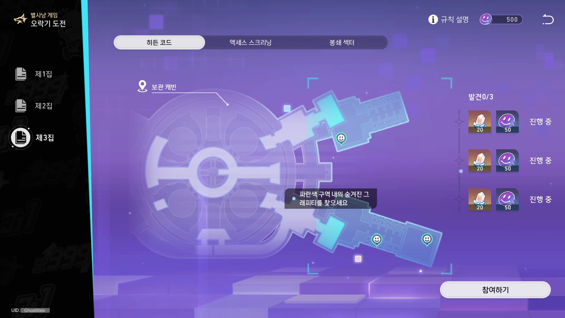 - 오락기 도전은 스토리 진행 후 도전할 수 있으며, 총 3가지의 컨텐츠가 3장으로 구분되어 있는데 2개는 필드 탐색, 1개는 전투 도전으로 구성되어 있어요.