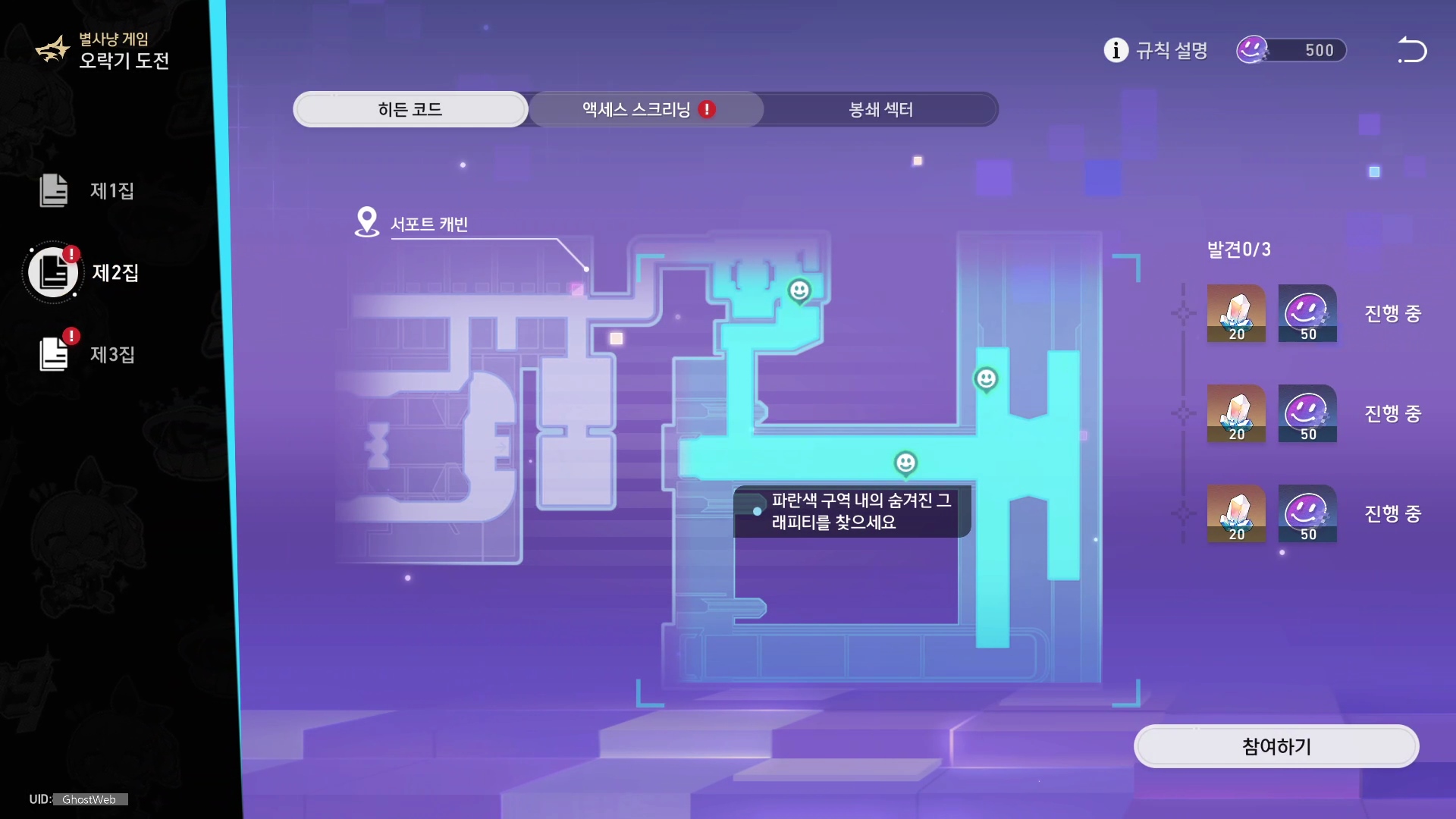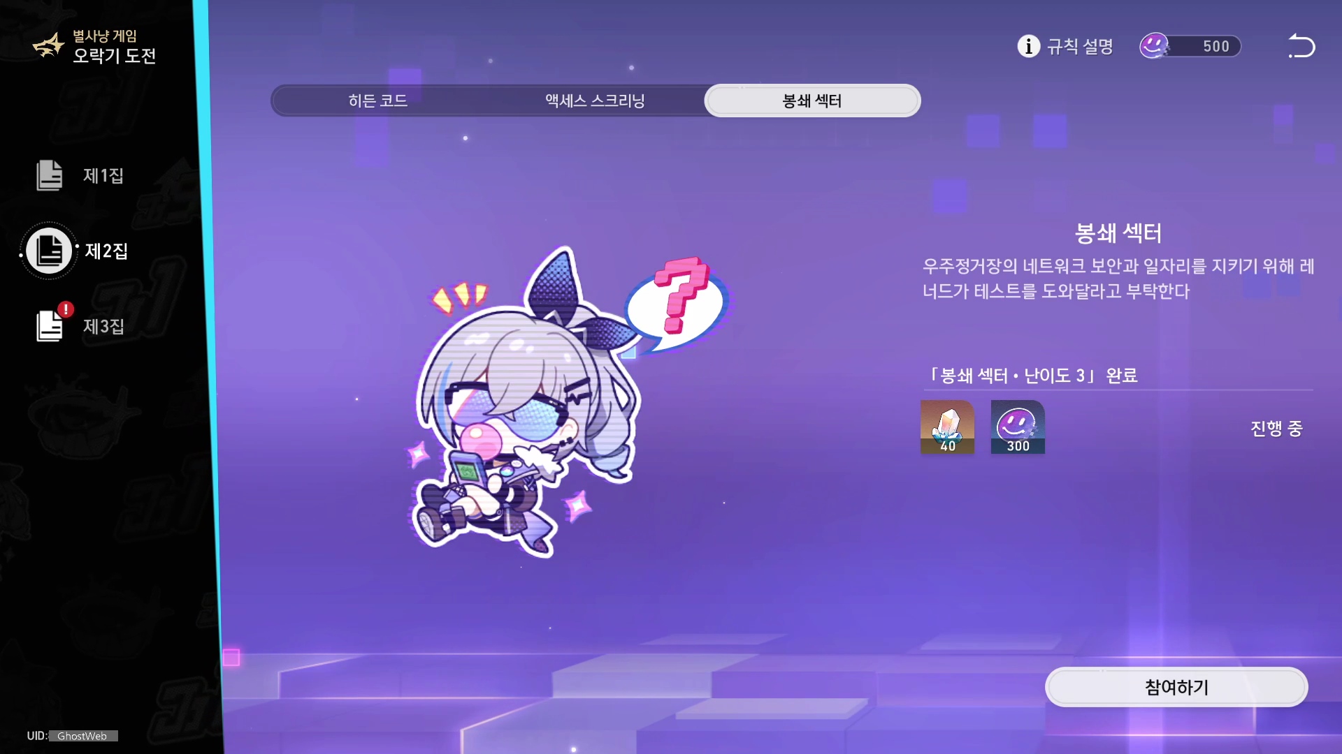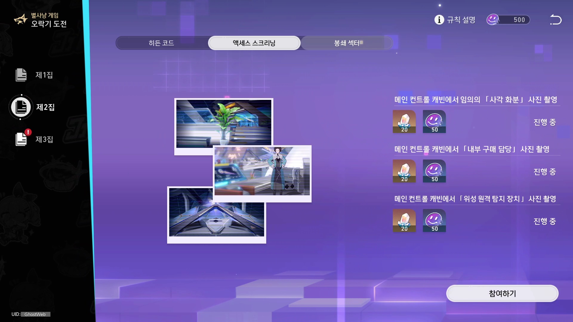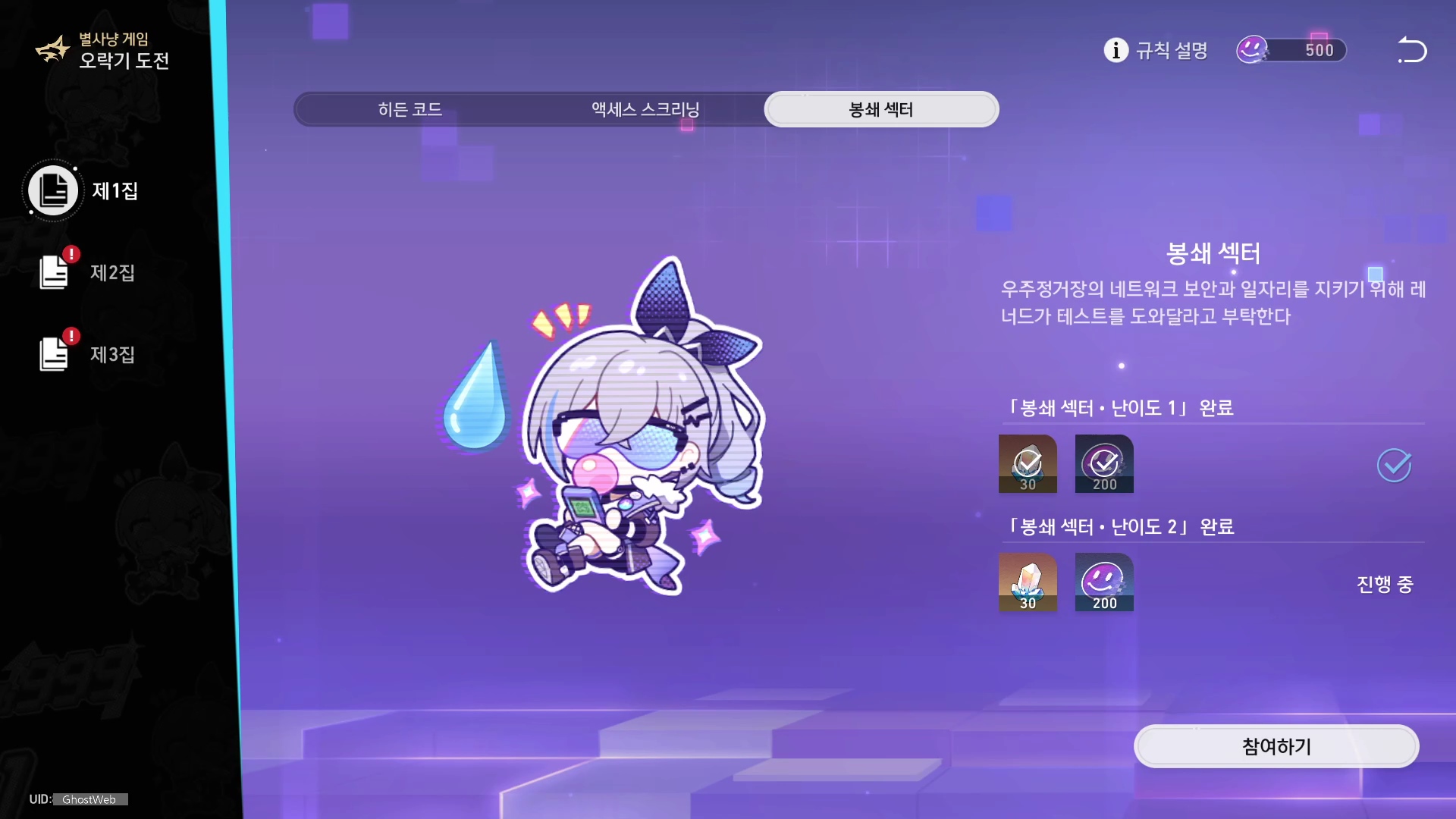 - 오락기 도전은 스토리 진행 후 도전할 수 있으며, 총 3가지의 컨텐츠가 3장으로 구분되어 있는데 2개는 필드 탐색, 1개는 전투 도전으로 구성되어 있어요.