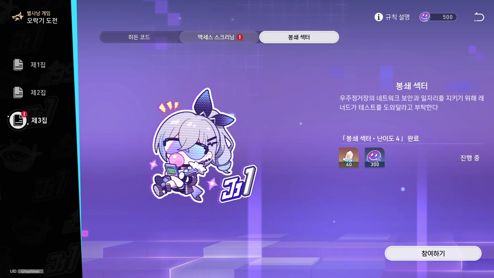 이벤트 진행을 통해 전자 그래피트, 4성 이벤트 광추인 [ 초보자 임무 시작 전(공허) ]를 얻을 수 있으며 부가 컨텐츠인 [오락기 도전]을 통해 포인트를 모아 딥 웹 마켓(이벤트 상점)에서 포인트를 육성 소재 등으로 교환할 수 있어요.
