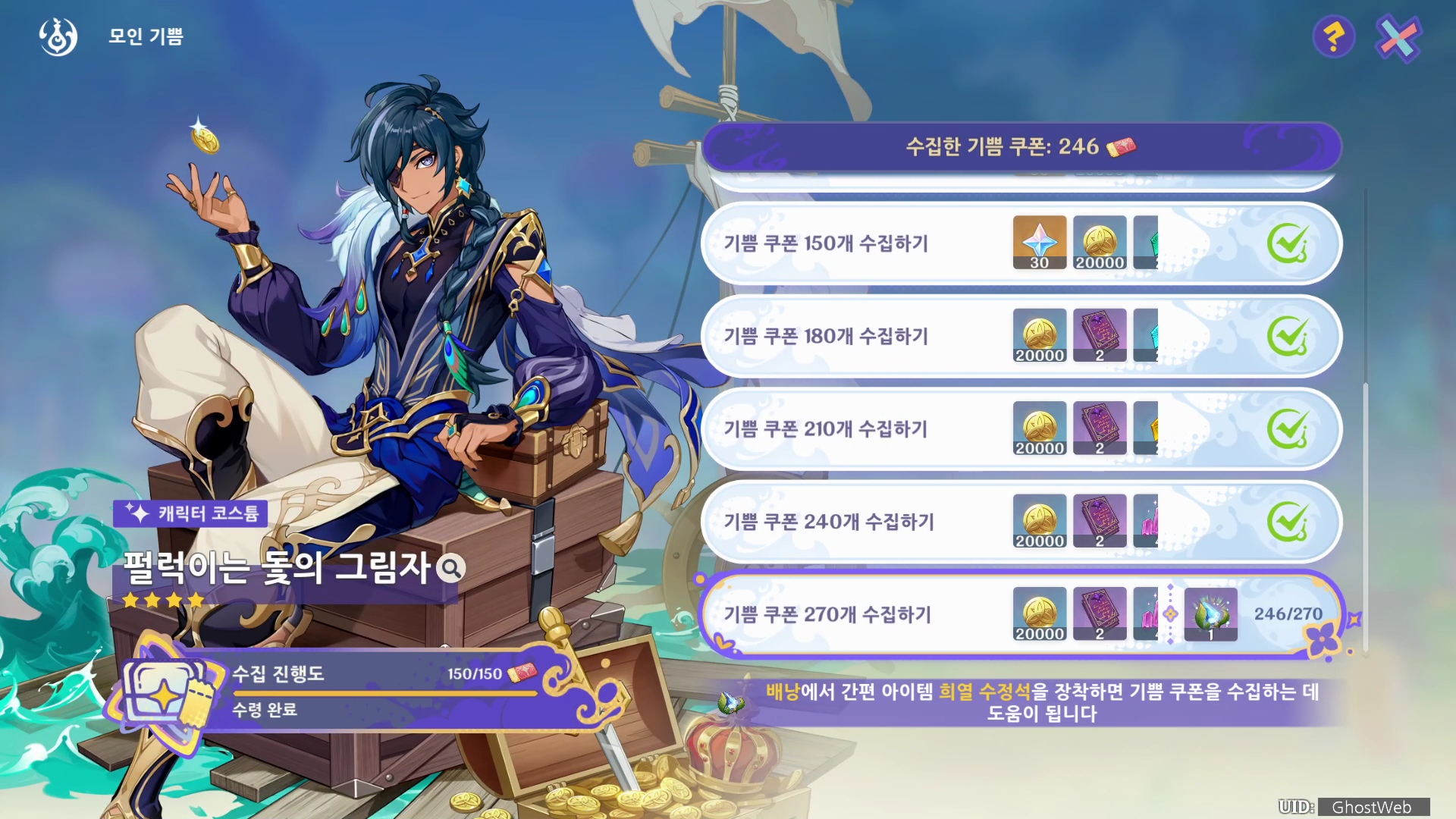 기쁨 쿠폰 150개를 모아 [ 여름! 낙원 대비경! ] 이벤트 창에서 케이아 코스튬인 [ 펄럭이는 돛의 그림자 ]를 얻을 수 있으며, 환희 수정석을 얻어 필드에 있는 기쁨 쿠폰, 보물상자의 위치를 빠르게 알 수 있어요.