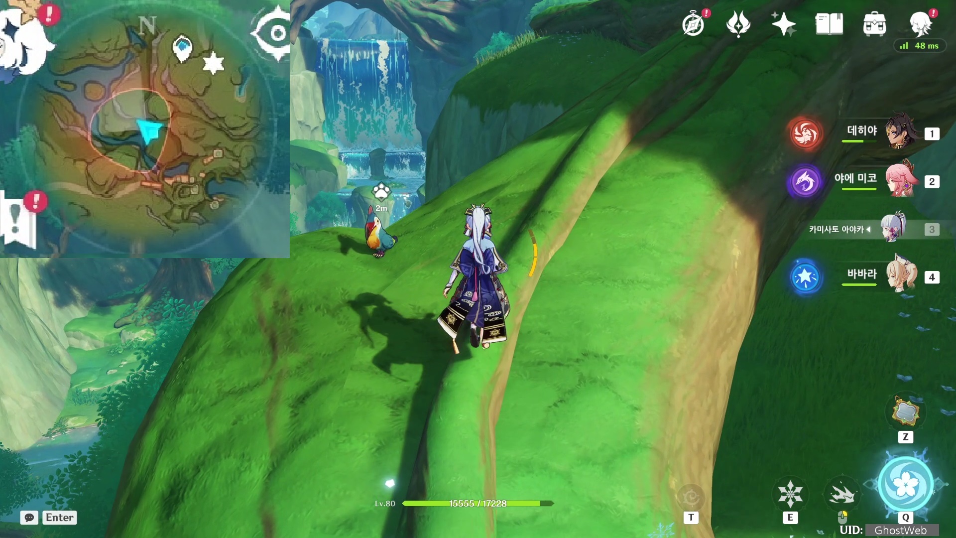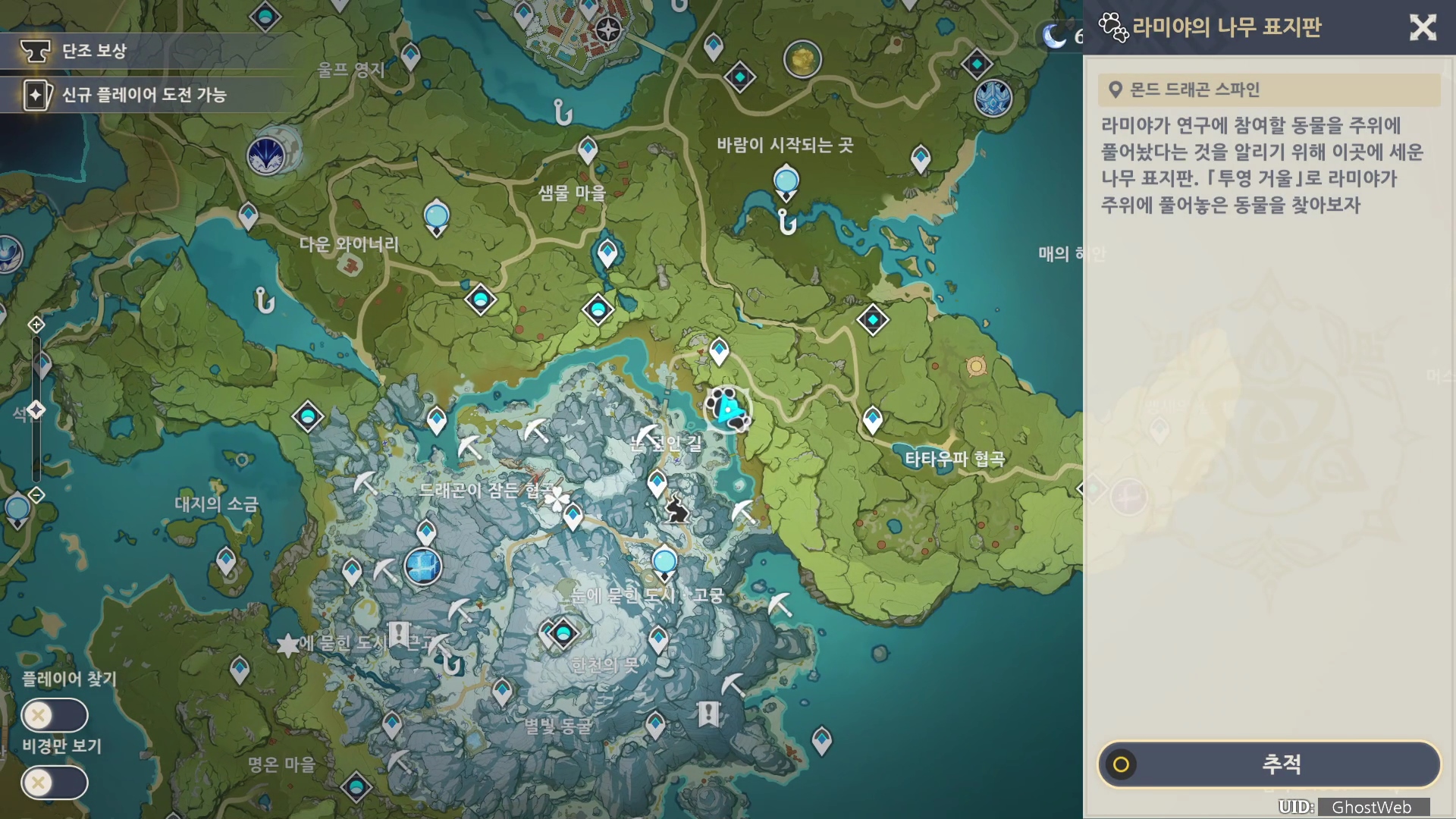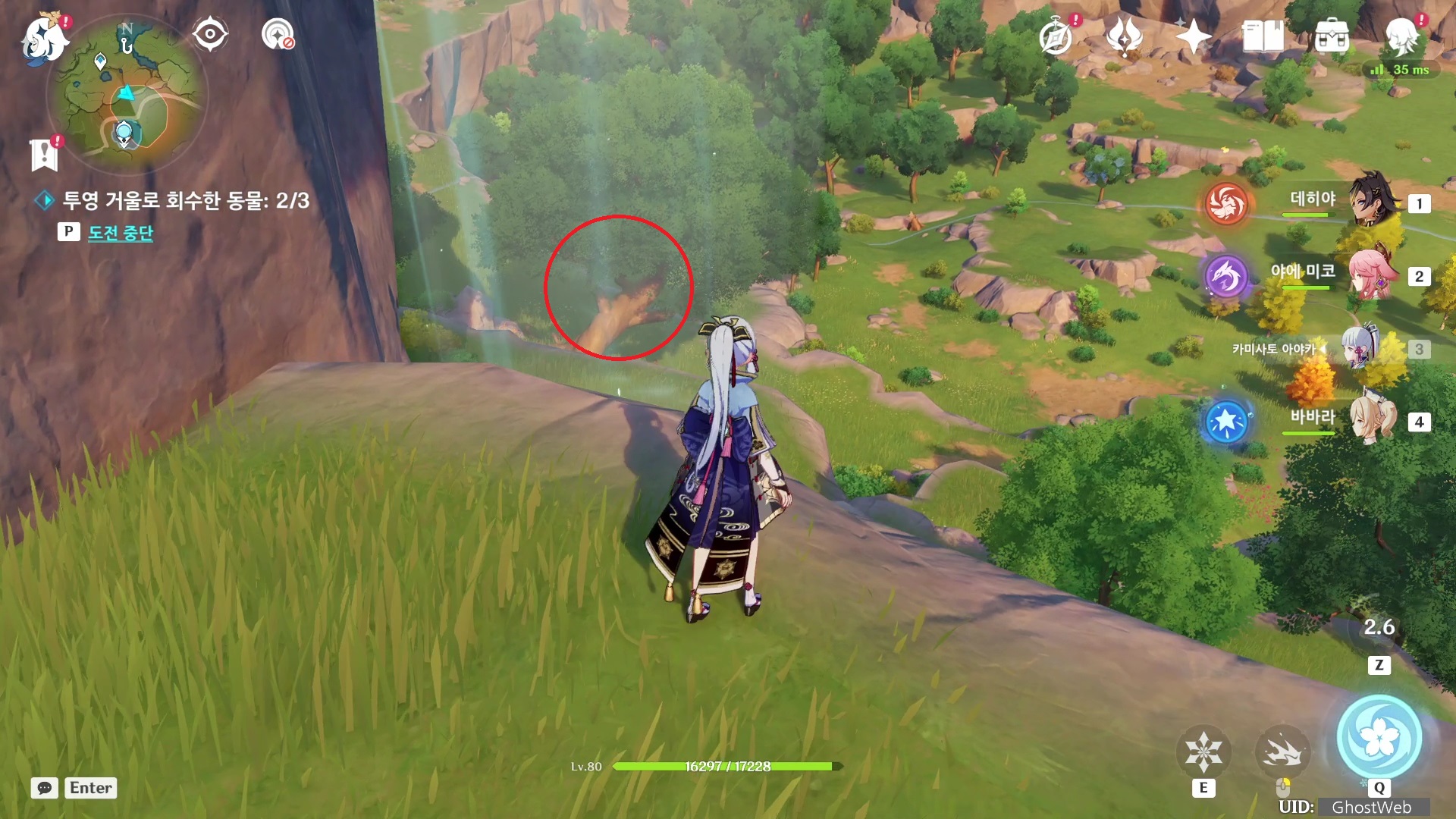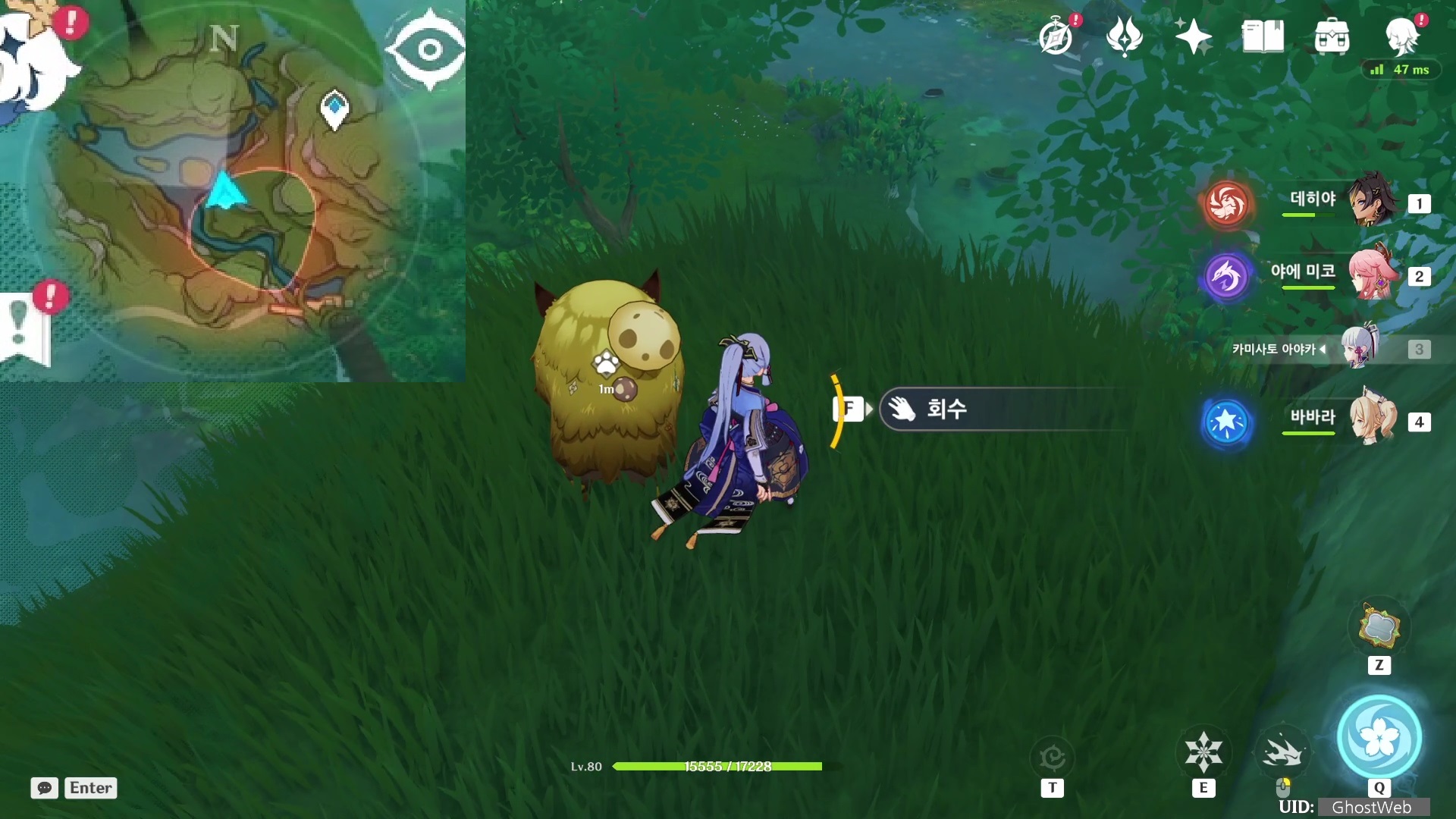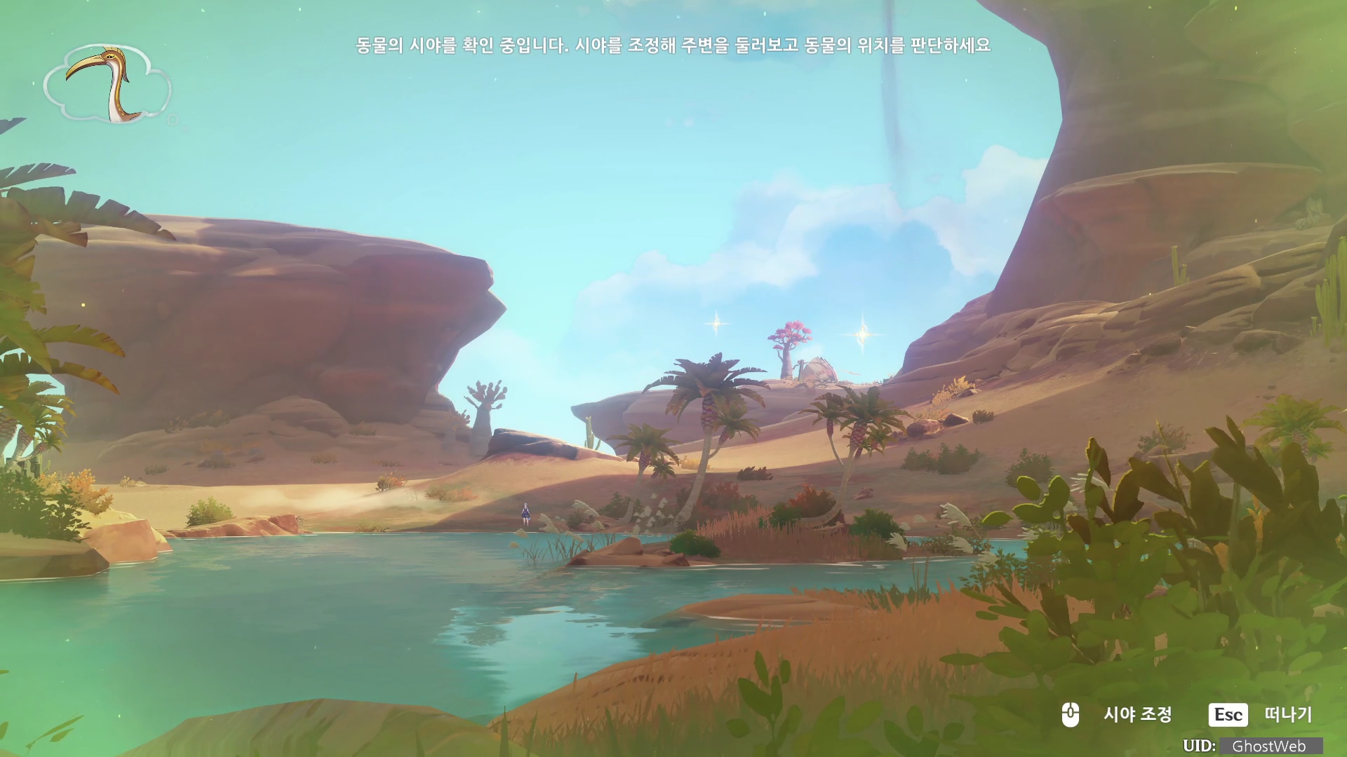 - Z키를 눌러 투영 거울을 사용하면 해당 동물이 보고 있는 풍경을 알 수 있으며, 원소 시야로 주변에 상호 작용 가능한 것이 보이니 잘 안 보인다면 원소 시야를 통해 찾아보세요.