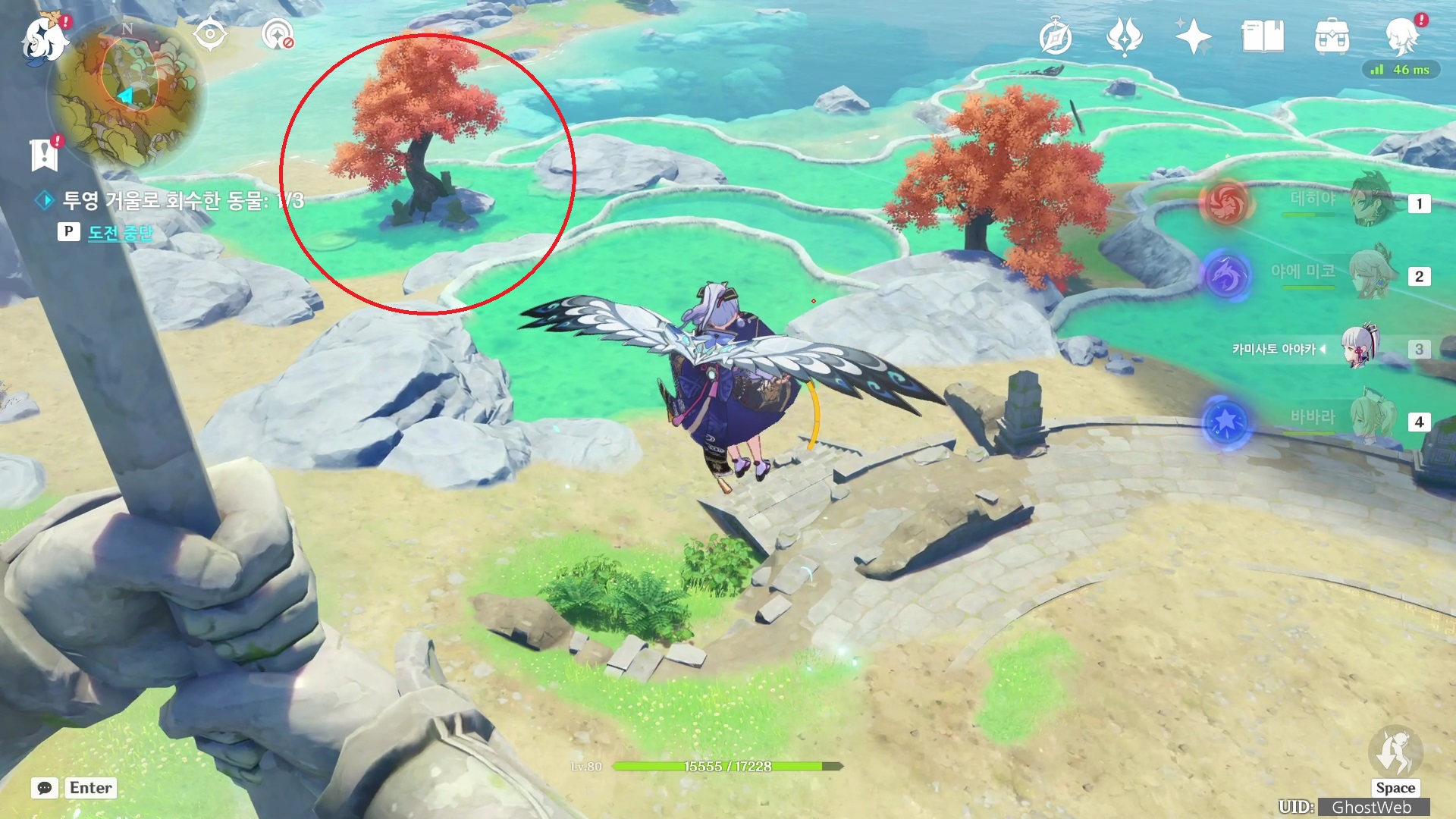 - 오른쪽에 있는 동상 어깨 위에 있는데 근처의 윈드 필드를 타고 동상 위로 올라가세요.