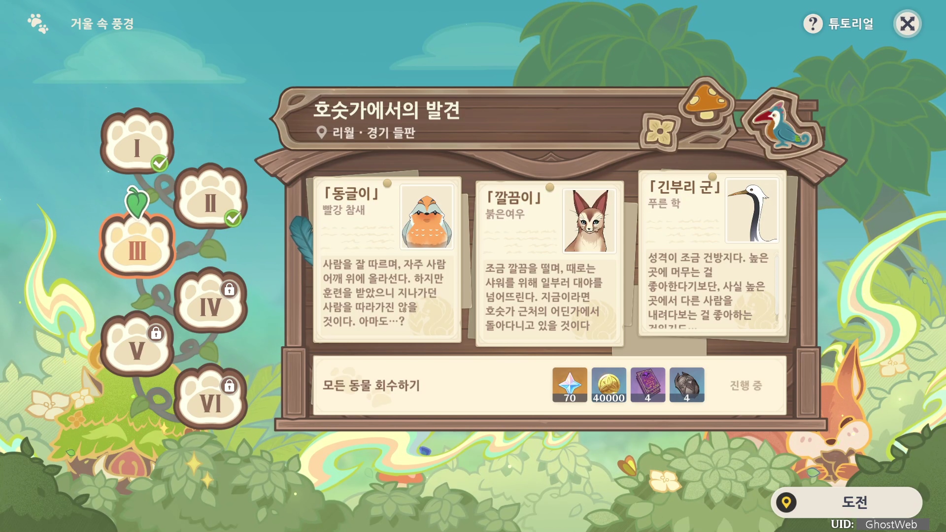 - 찾아야되는 동물 : 빨간 참새 (동글이), 붉은 여우 (깔끔이), 푸른 학 (긴부리 군)