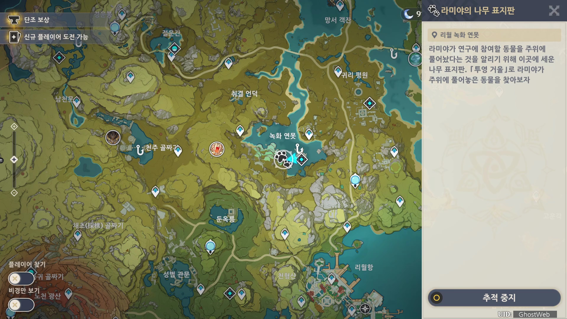 - 이벤트 위치는 지도에서 리월 녹화 연못 근처에 표지판이 있으며, 표지판과 상호 작용을 하면 해당 컨텐츠를 진행할 수 있어요.