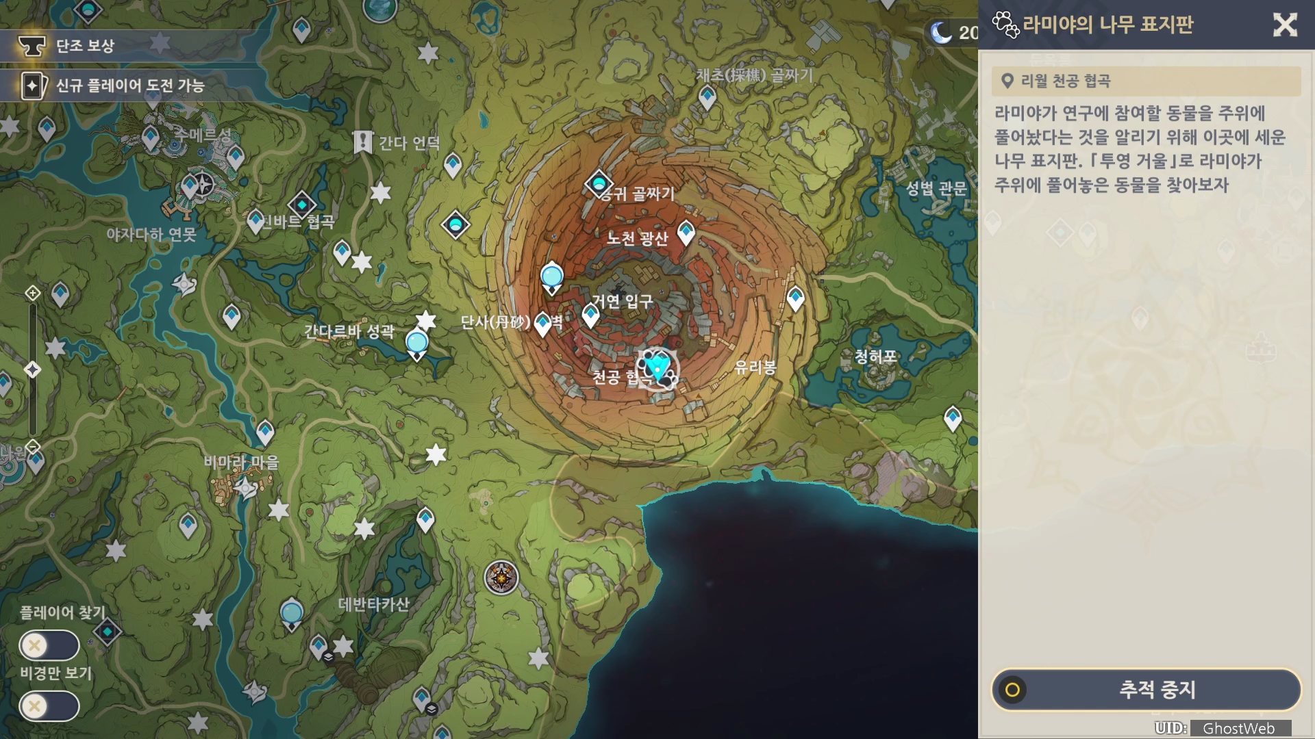- 이벤트 위치는 지도에서 리월천공 협곡 근처에 표지판이 있으며, 표지판과 상호 작용을 하면 해당 컨텐츠를 진행할 수 있어요.