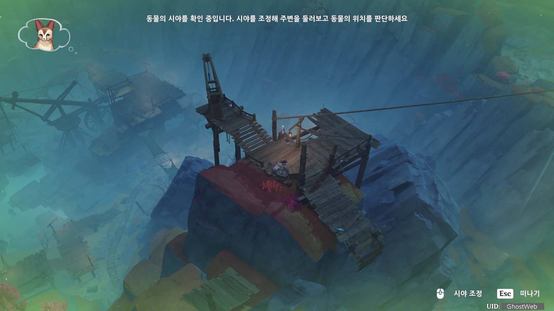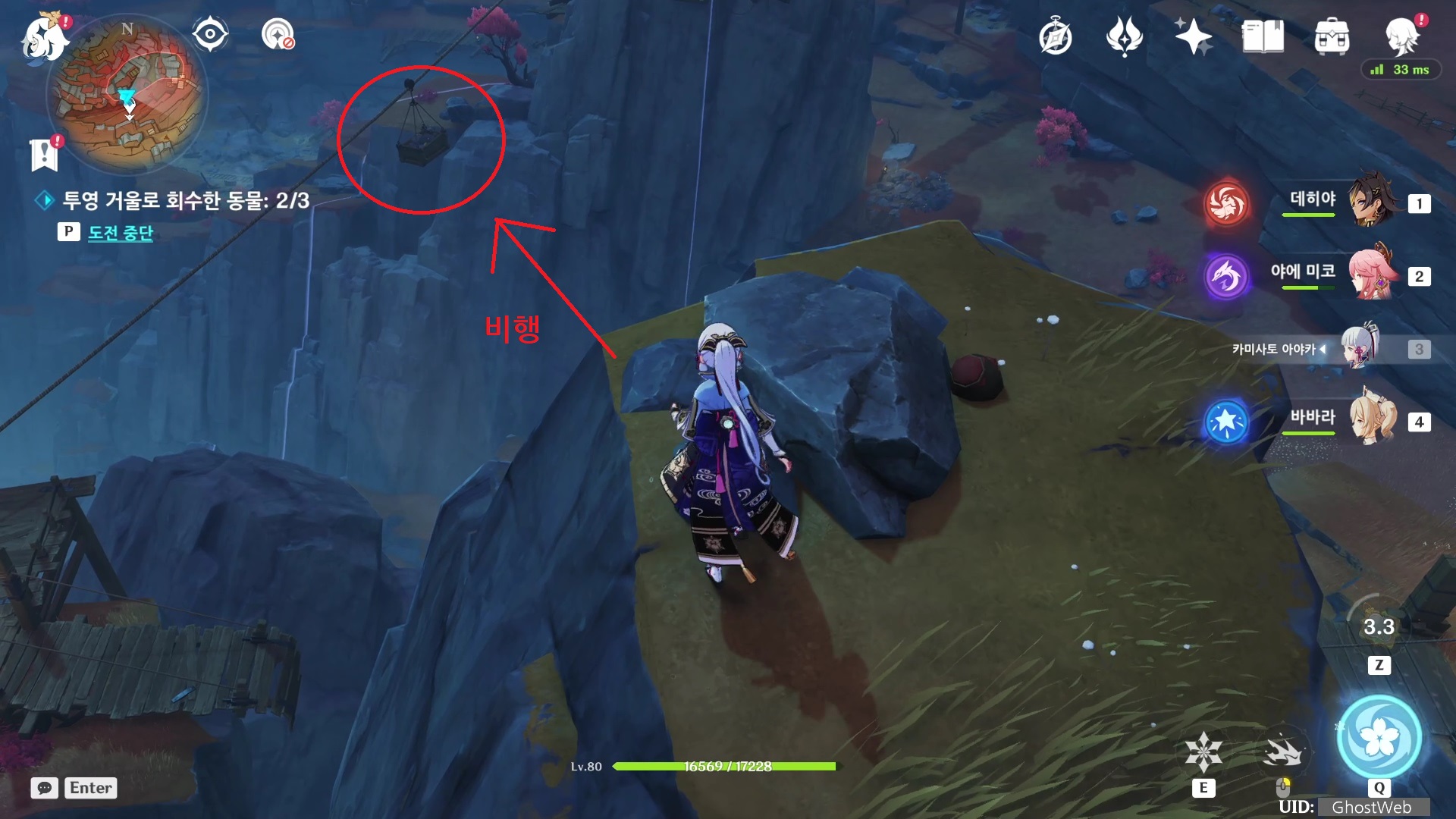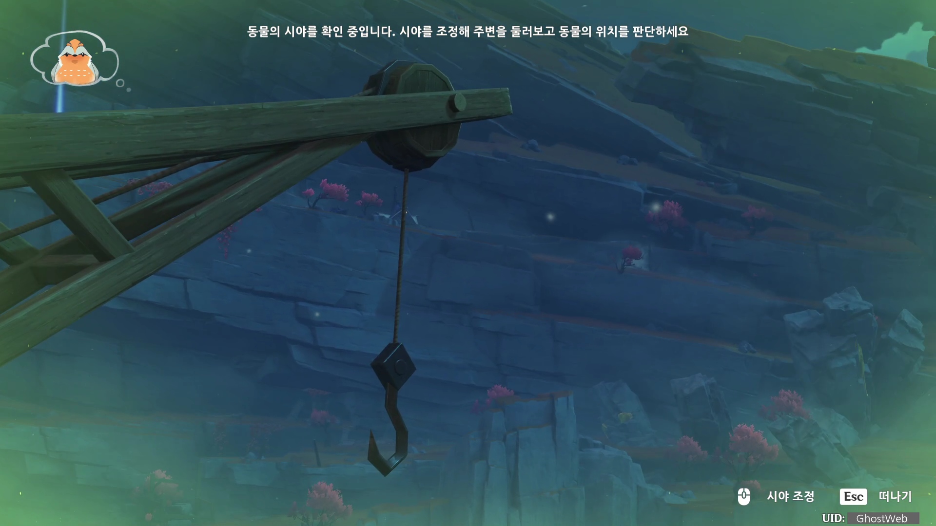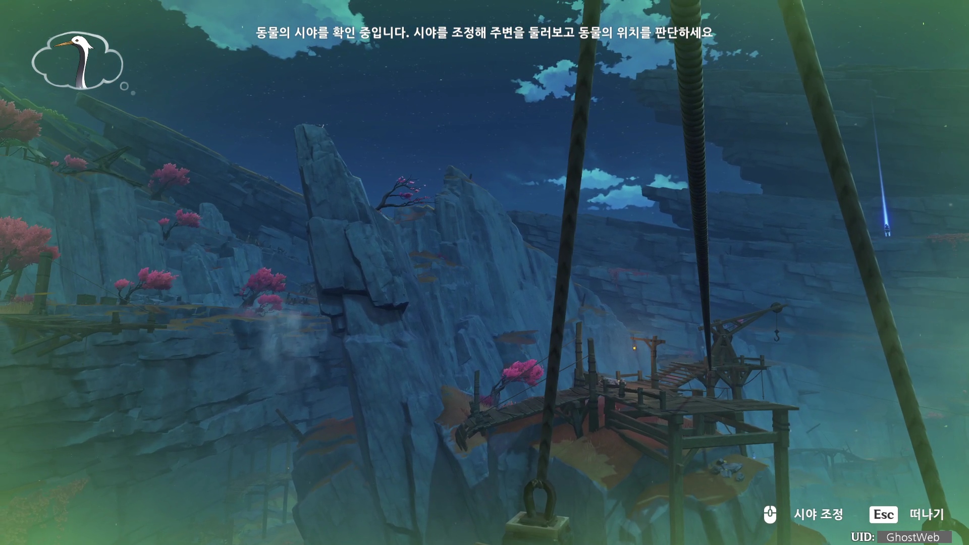 - 붉은 여우 잡은 곳에서 빨강 참새가 잡았던 크레인 기준 오른쪽 편에 공중에 정지해 있는 수레로 비행을 해서 가면, 푸른 학을 찾을 수 있어요.